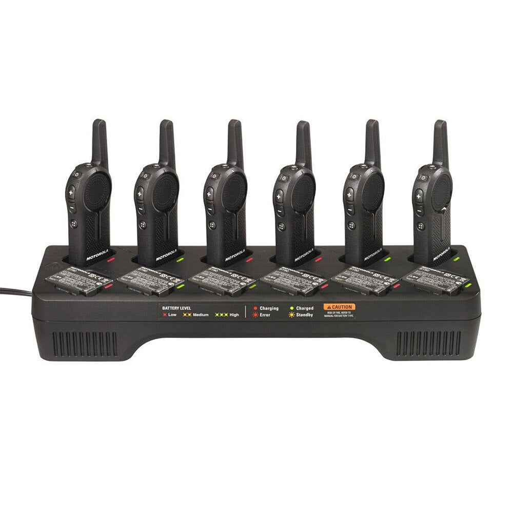- The battery charger is sleek in design and can hold 12 Motorola CLS and DLR Series two-way radios.