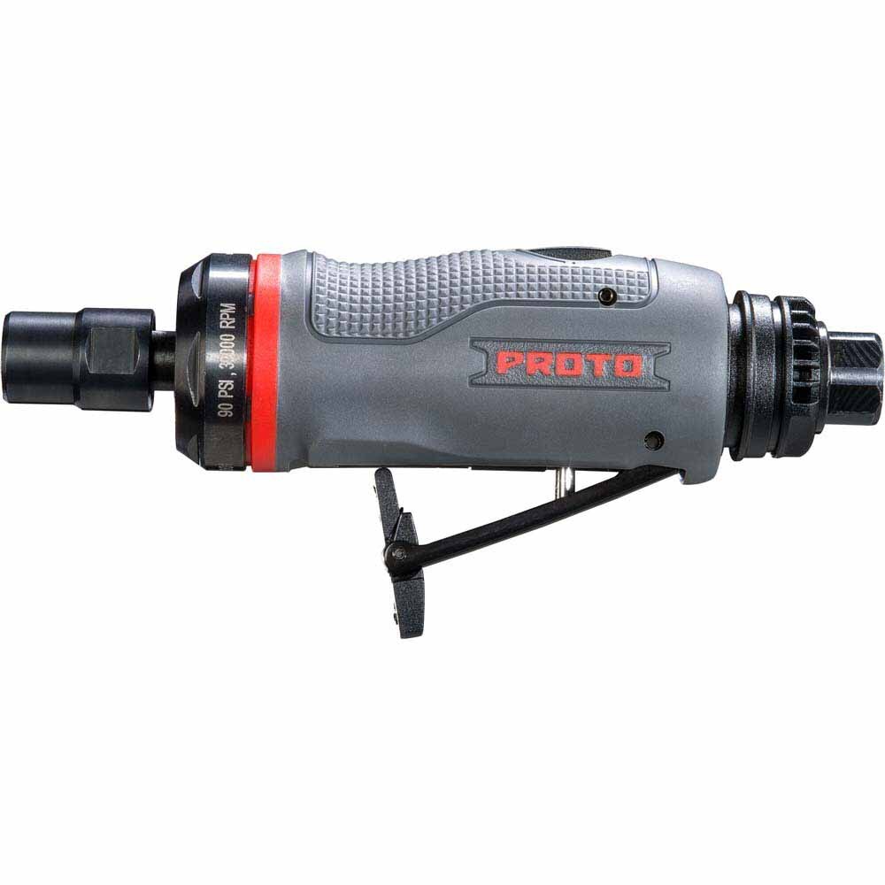 This straight air die grinder has a 0.3 HP motor and a 30000 RPM free speed. This heavy-duty grinder is 6 1/8 inches long with a 1/4-inch collet. This grinder has a 2.75 average CFM at 15-second run time and a 60-degree rotating exhaust. It features a tool-free power adjustment, improved throttle with lockout, and a comfort rubber grip. The handle is made from steel with overmould.