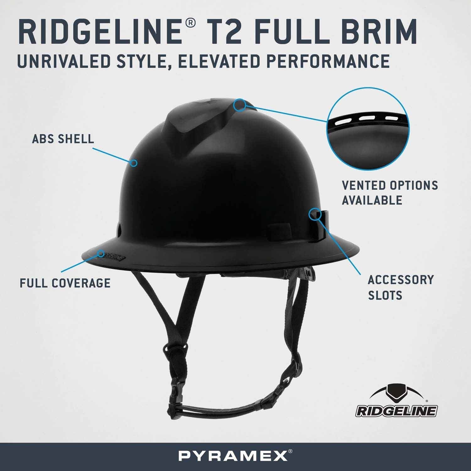 Pyramex HPT256111V Ridgeline T2 Full Brim Hard Hat - Vented - Black - 6pt Ratchet Suspension