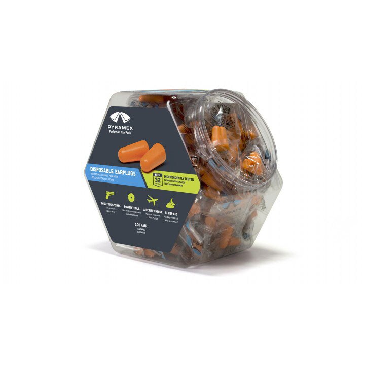 Pyramex Retail - DP1000 Earplug Bin Tub - NRR 32dB / SNR 36dB. Contoured fit disposable polyurethane ear plugs. Plug gently expands and self adjusts to all size ear canals.