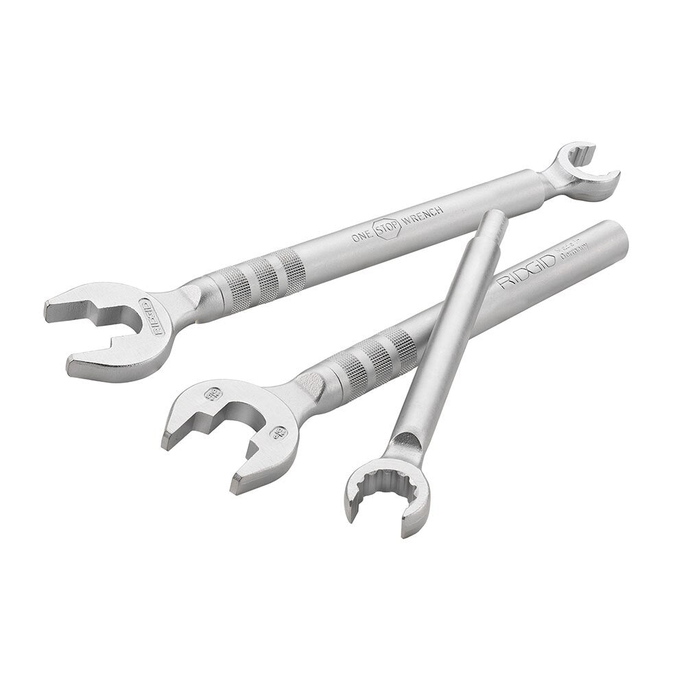 The Ridgid 27023 One Stop Wrench is two wrenches in one. This wrench has a smaller wrench placed inside the body of a larger wrench. Why have two wrenches add weight to your tool box when you really only need one. It provides the exact size wrench you need to install angle stops and compression couplings.