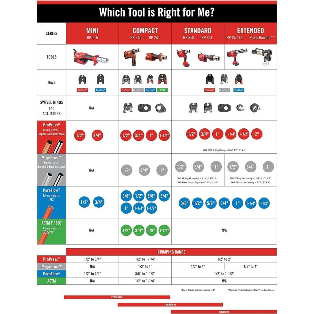 - Presses 1/2" to 2" PEX, 1/2" to 4" Copper and Stainless Steel, or 1/2" to 4" Carbon Steel* *Press Booster is needed for 2 1/2" to 4"