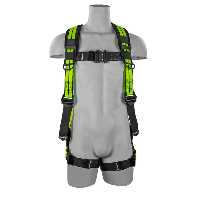 The Safewaze Pro+ Flex Vest Harness offers the utmost in comfort and movement. Ergonomic Flex webbing provides easy movement without the drawbacks of elastic webbing. Unique adjustable buckles make harness fitting a snap. Impact absorbing shoulder pads with reflective piping and intelligent cell foam, quick release leg buckles with cool air leg pads and a quick release chest buckle insure maximum operation and performance.