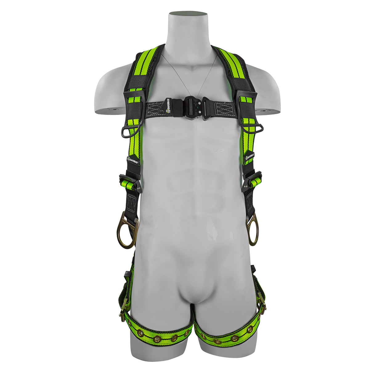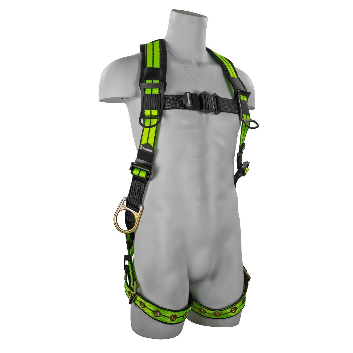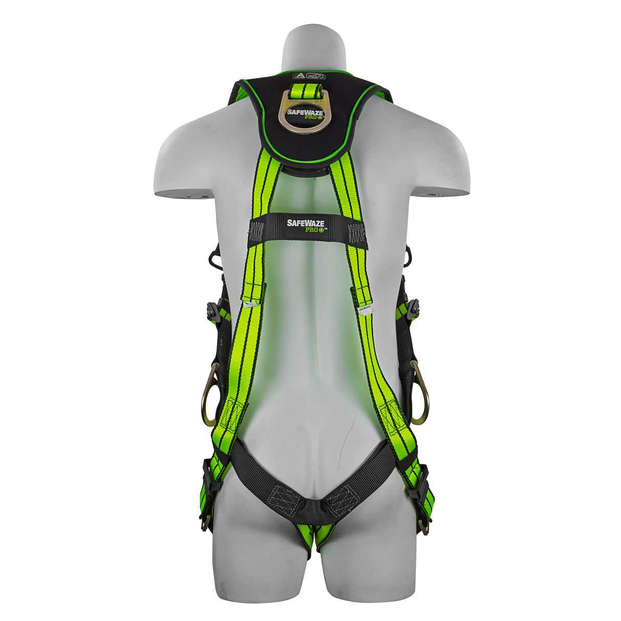 The SafeWaze Pro+ Flex Premium Vest Harness utilizes Flex webbing in a memory fit design, with quick release connection buckles, which enables harness fitting memory between usage. Impact absorbing shoulder pads feature reflective piping and intelligent cell foam. This an ideal choice for many trades when constant off and on usage is required.