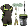 A premium collection of materials for roofing - harness, lifeline, energy absorber and anchor - conveniently packaged in a durable plastic bucket with lid.