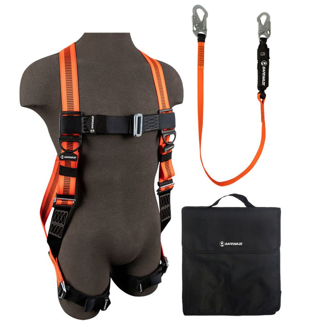An economy combination of harness and lanyard for easy compliance conveniently packaged in a heavy duty carry bag.