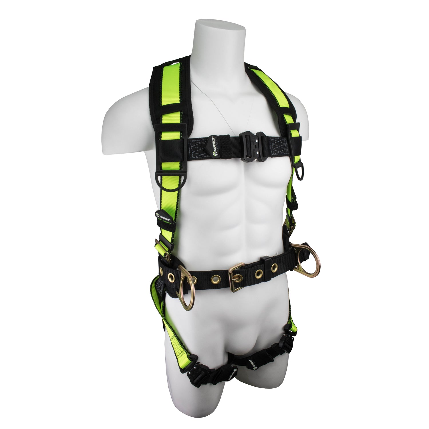 | Materials | 1.75" (44.45 mm) High-Visibility Polyester Webbing, 1.75" (44.45 mm) Black Polyester Webbing, Plastic Lanyard Keepers, Polyester Mesh Pads, Forged Steel D-Rings, Aluminum Quick-Connect Chest and Leg Buckles, Steel Sizing Adjustment Buckles |