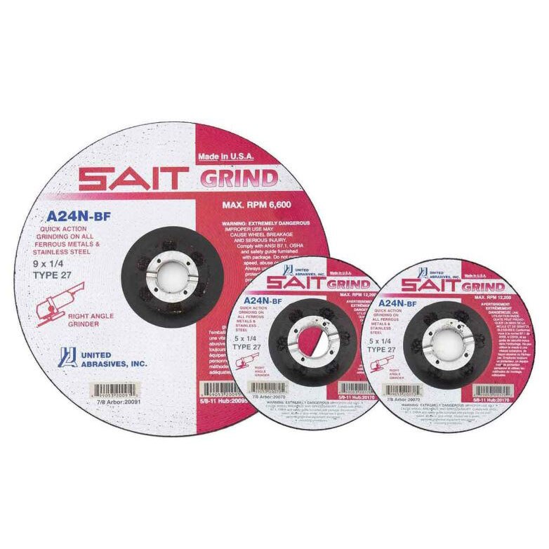24N - Fast Grinding. Aluminum oxide grain. Soft bond for fast stock removal. Ferrous Metals: iron, steel, welds, etc. Low grade stainless steel. Specifications: Max RPM - 10200, 5/8-11 Super-Lock hub. Tech Info: Virgin aluminum oxide grain assures consistent high stock removal for tough applications. All sizes are made with uniform grain throughout, no filler grain used in the backing. All wheels internally reinforced with the highest quality fiberglass for maximum safety. Super-Lock Hub on all 5/8-11 threaded wheels is the safest, vibration-free design.