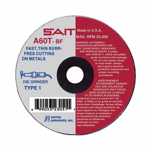 The A60T is a thin, hard bond aluminum oxide wheel for use in plant maintenance, and nuclear, aerospace, automotive, and foundry industries. Externally reinforced with fiberglass layers to provide the ultimate safety in a thin wheel. Offers aggressive action and a hard bond for smooth cutting. Type 1/Type 41 shape for square, burr-free cutting. Used for high-tensile metals and ferrous metals such as iron, steel, welds, etc. Package of 100. *Note: 20% restock fee on all SAIT/United Abrasives returns.