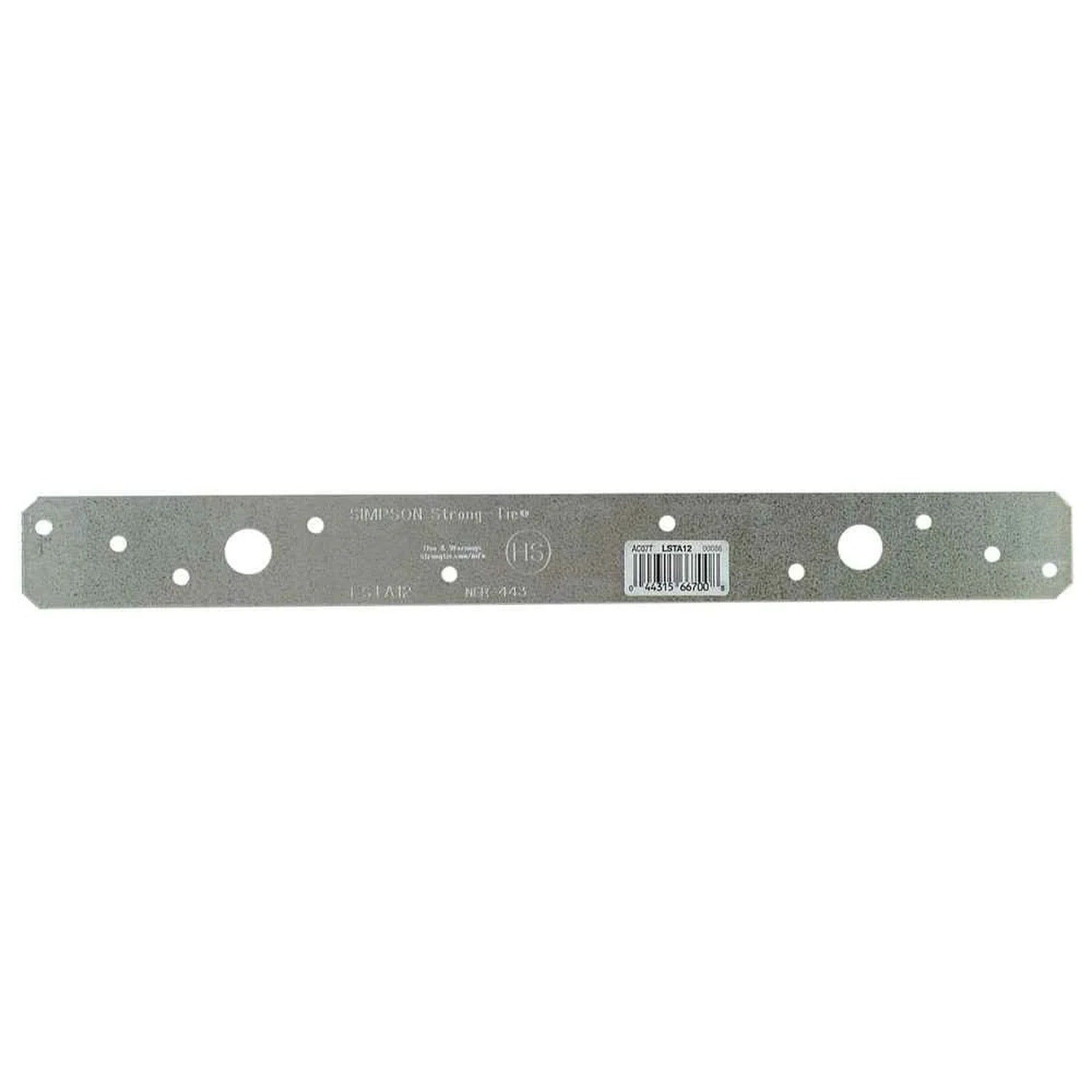The Simpson LSTA12 Strap Tie is a 12-inch, 20-gauge tie with a G90 galvanized finish, designed for edge use on 2x members with a nailing pattern that minimizes splitting.