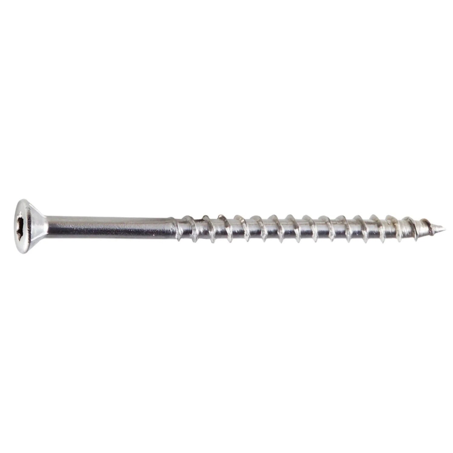 The Deck-Drive DWP Wood SS Screw is designed for exterior wood applications, featuring a sharp point and box threads for efficient fastening.