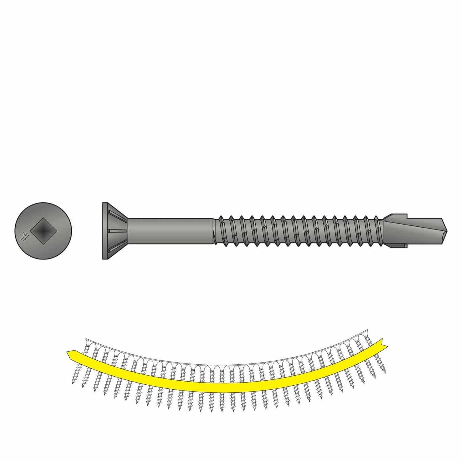 The Quik Drive TB Wood-to-Steel Collated Screw is designed for fastening wood to steel with a maximum thickness of 1/4 inch. It features a flat head with nibs for easy countersinking and a #4 drill point with wings for general duty applications.