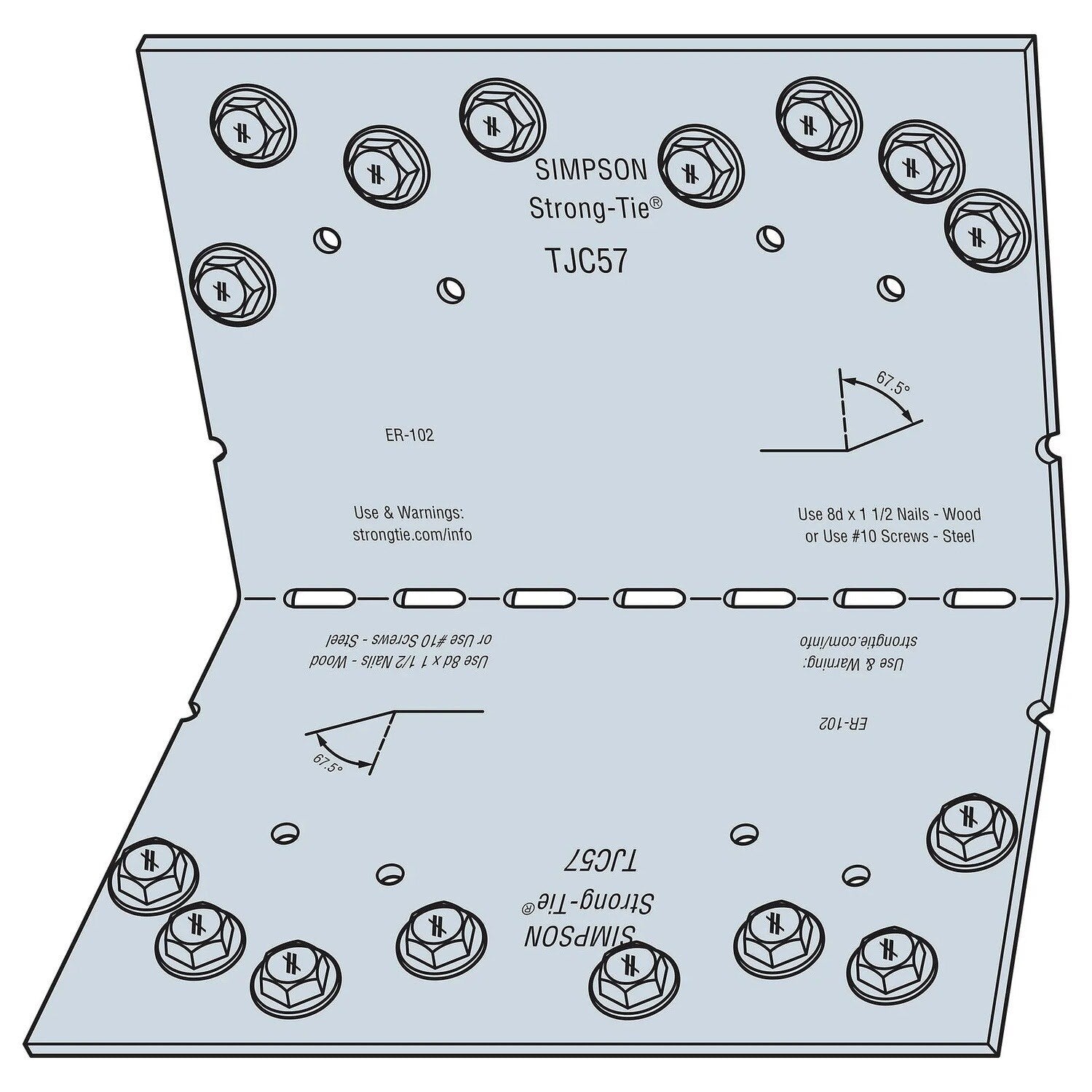 The Simpson TJC57 is a versatile connector for jack trusses, adjustable from 0° to 85°, with a G90 galvanized finish for durability.