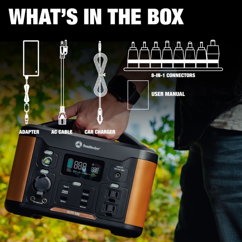 Wherever your next adventure leads you, Southwire’s Elite 500 Series Portable Power Station with Solar Panel Bundle offers power on-the-go. Whether you’re dealing with an unexpected power outage, or you’re planning a trip out in the woods - this bundle is curated for your power needs. With the Portable Power Station’s 515 Watt-hour certified lithium-ion battery, six ways to charge, and built-in LED light - you’ll have power that lasts when it matters most. Enjoy the convenience of the 100-Watt solar panels that quad-fold into a light carrying case and are made of monocrystalline for more energy per square foot. You’ll always have power whenever, wherever.