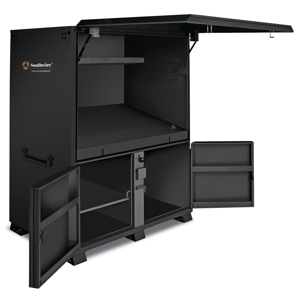 Southwires Field office brings the contractor a mobile working platform that incoperates a large area for working with prints and drawings. Combine this with the added shelved storage, giving you all the space needed for success. With the Southwire Field Office there is no better way to control and secure your livelihood.