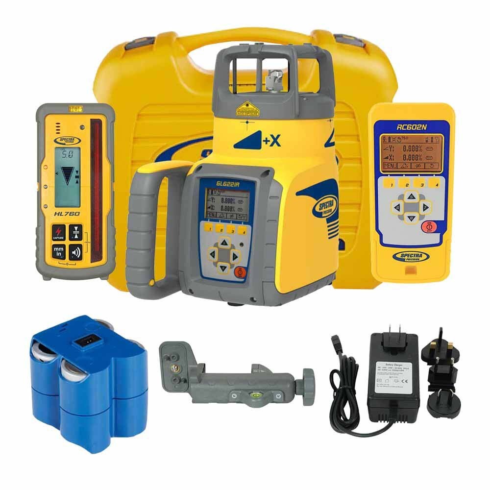 The Spectra GL622IR grade laser uses an invisible Class 1 infrared laser beam that is perfect for general construction, railway jobs, mining tasks, and other special applications where a visible beam is not safe to use. With an optional RC602N remote control, the GL622IR allows contractors to make grade changes and begin mechanical alignments remotely up to 490 feet away. This Spectra dual grade laser also performs quick setups for horizontal and grade tasks.