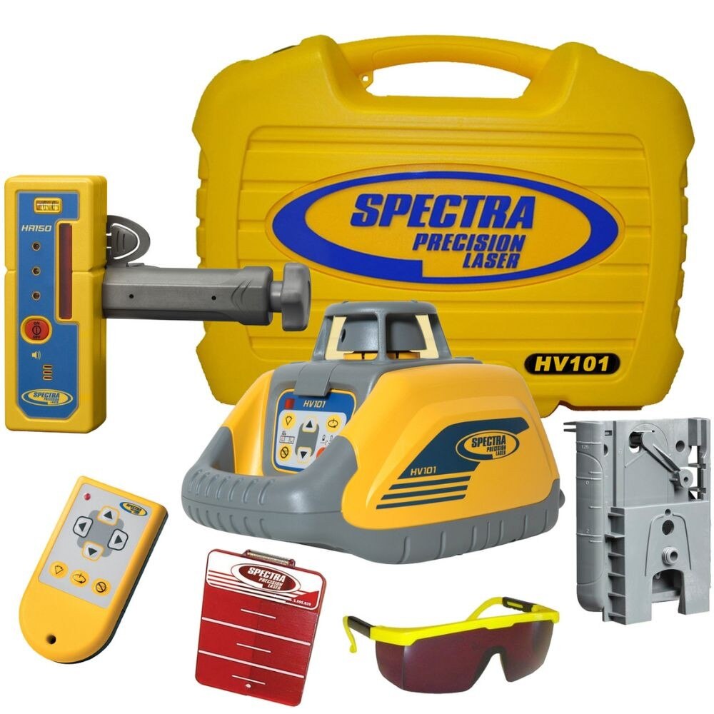 - The Spectra HV101 laser level features four rotation speeds: 0, 50, 200, and 600 RPMs