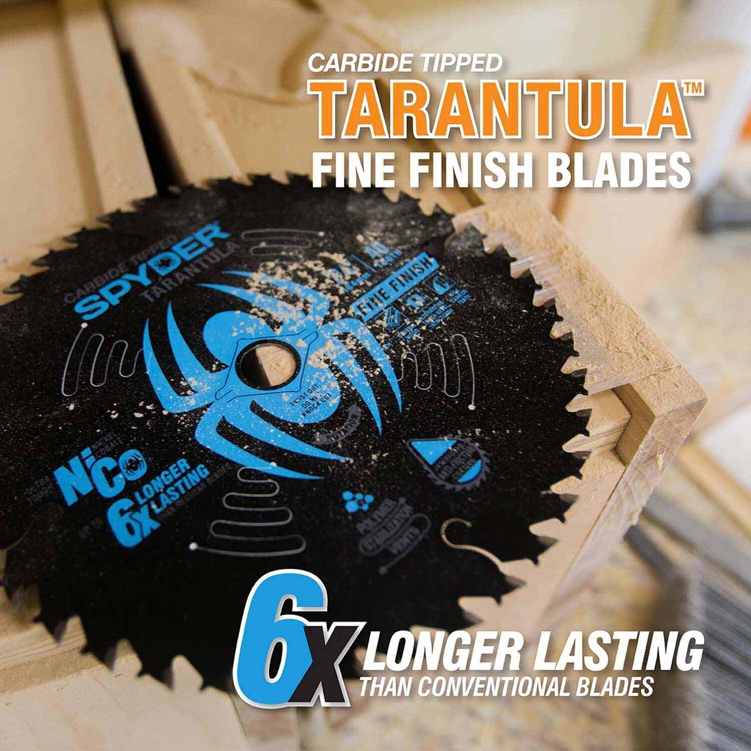 Rip and crosscut with ease with Spyder Tarantula Fine and Ultra Fine circular saw blades. NiCo teeth are sharpened 3x to provide clean cuts and exceptionally long life. Tracking straight with reduced friction, heat and noise, Tarantula circular saw blades are the professionals choice for framing and construction.