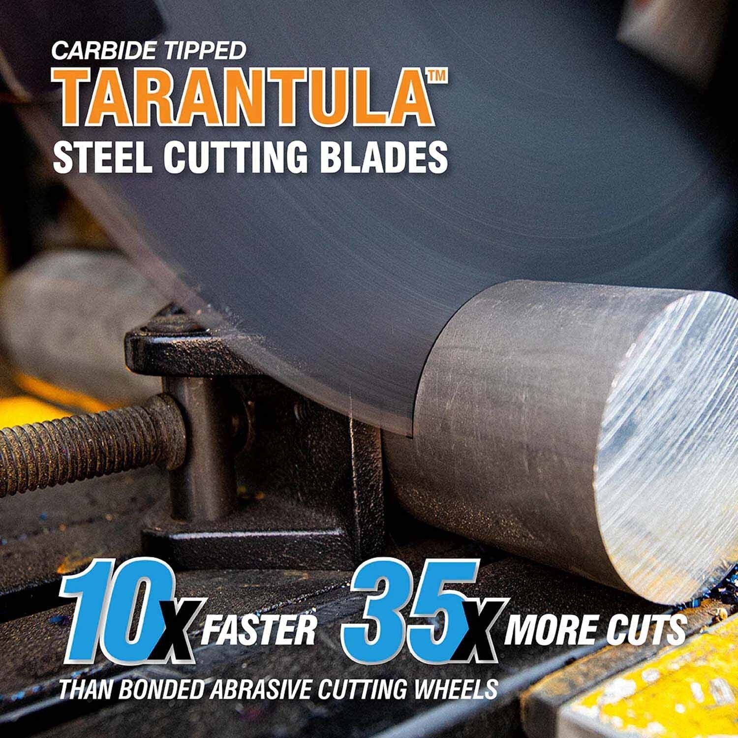 Spyder Tarantula metal-cutting circular saw blades are the ideal choice for clean cutting steel and other metal profiles. These high-performance blades last up to 35x longer than standard bonded abrasive cutting wheels and make those cuts up to 10x faster. Ultra tough NiCo2 carbide cutting teeth, made with upgraded nickel cobalt, feature a modified triple chip grind for unsurpassed cutting speed, life, and cleanliness.