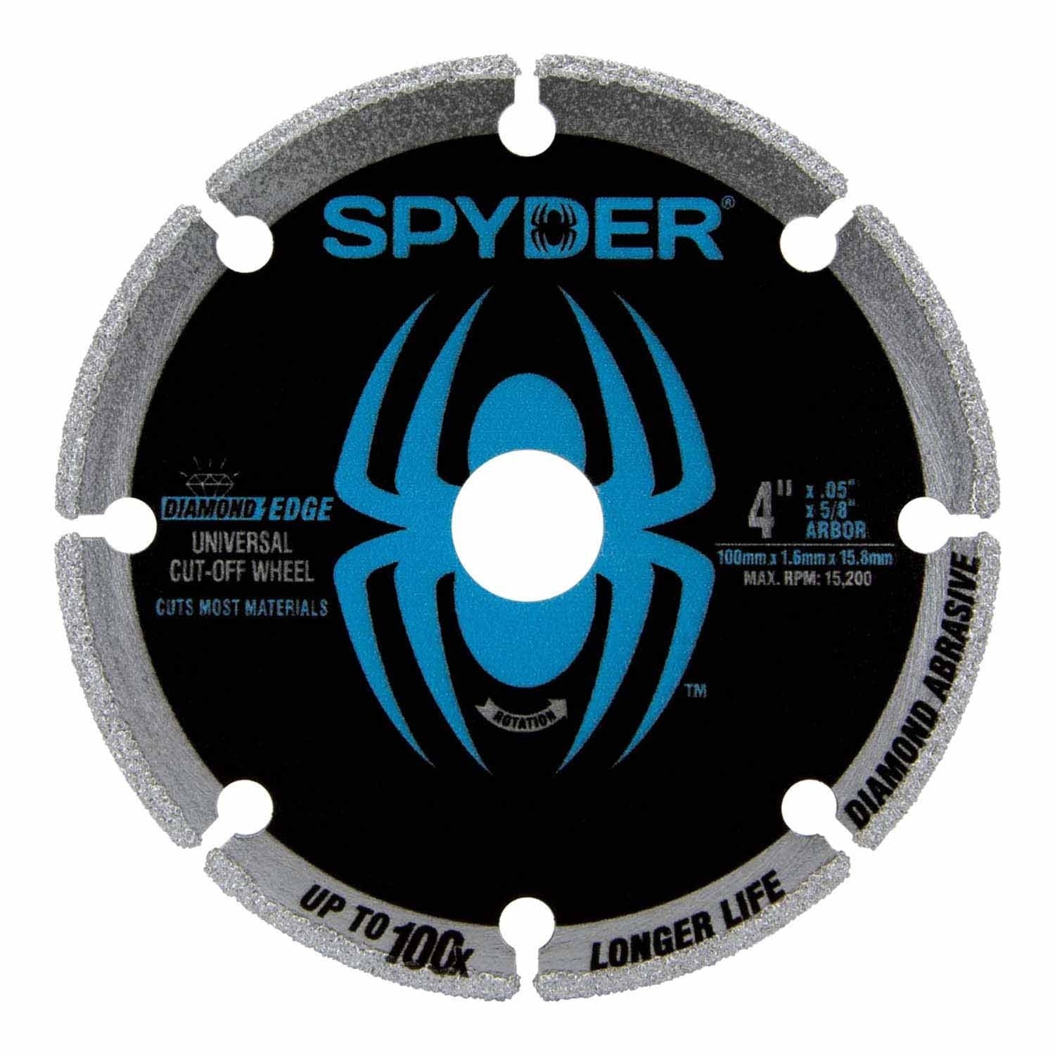 Spyder Diamond Bite universal cut-off wheels feature a diamond abrasive edge, combined with a shatter-resistant steel core. Together, these ensure safe operation, reduced dust and debris and a much longer working life than typical wheels up to 100x more cuts. For use on most materials including steel, stainless steel, cast iron, rebar, masonry, ceramic tile, composites, and more.