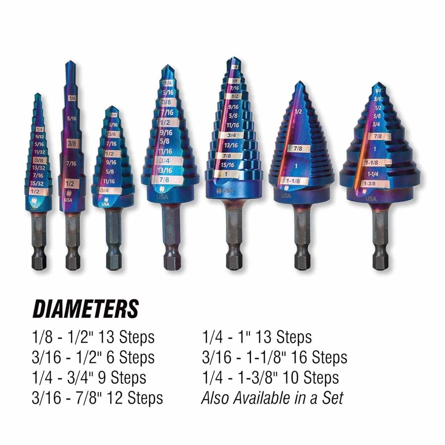 Bit Size(s): | 9 Steps- 1/4, 5/16, 3/8, 7/16, 1/2, 9/16, 5/8, 11/64, 3/4-Inch |
