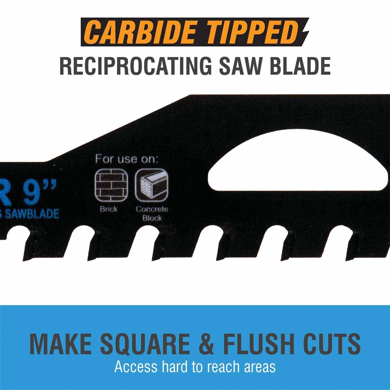 Tungsten carbide teeth combined with the power of a reciprocating saw quickly cut through brick and mortar, stone, concrete (cinder) block, timber and much more. Recommended for use on concrete products, brick or timber materials.