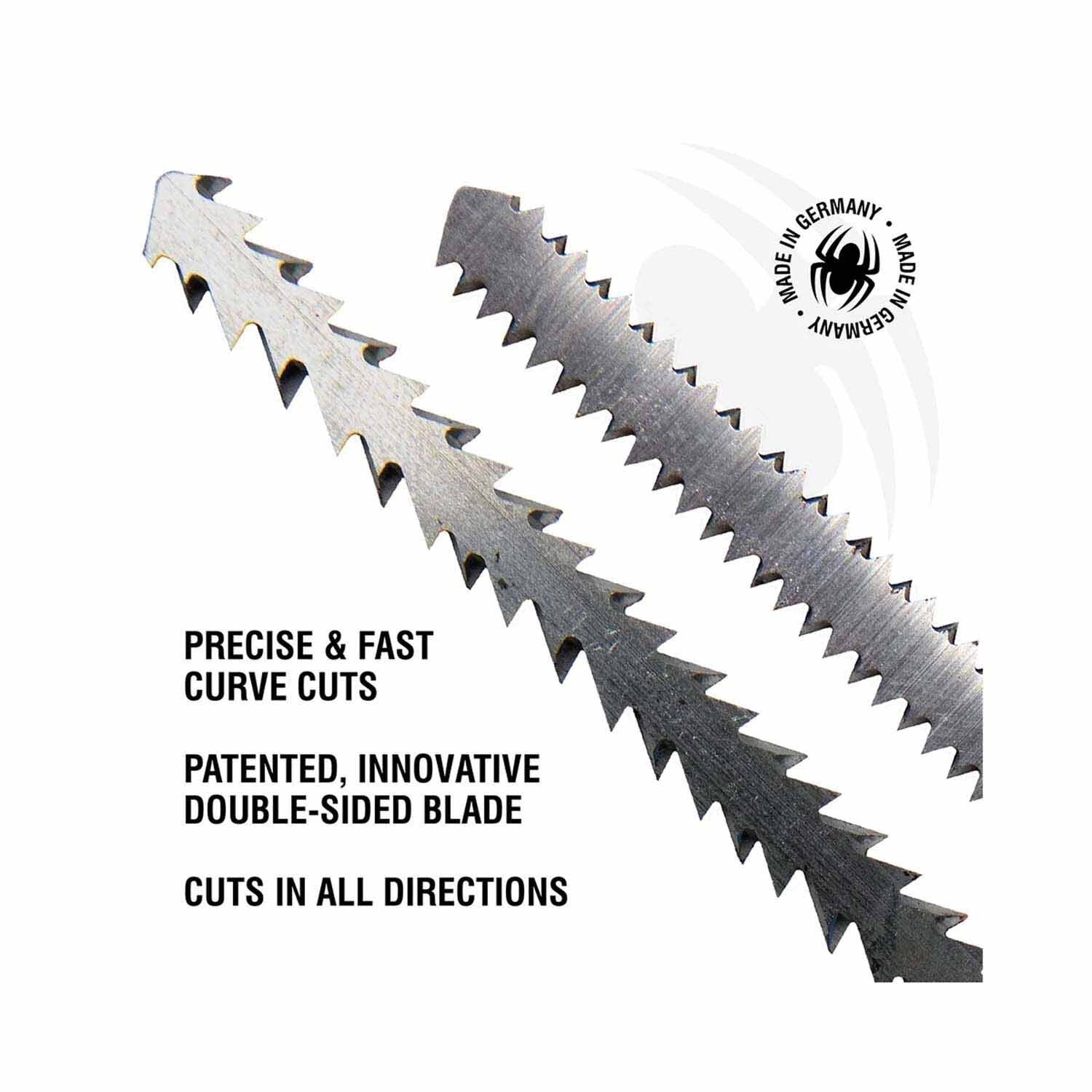 Cut your work in half by using Spyder jig saw blades! Spyder's made-in-Germany Chrome Vanadium jig saw blades are ideal for tough cutting tasks that require the clean curve or straightest linear cuts in wood. Made for hard wood, these blades help get the job done faster and easier with teeth on both sides for the cleanest curved cuts. Their universal T-shank can be used in all major brands of jig saws, both corded and cordless.
