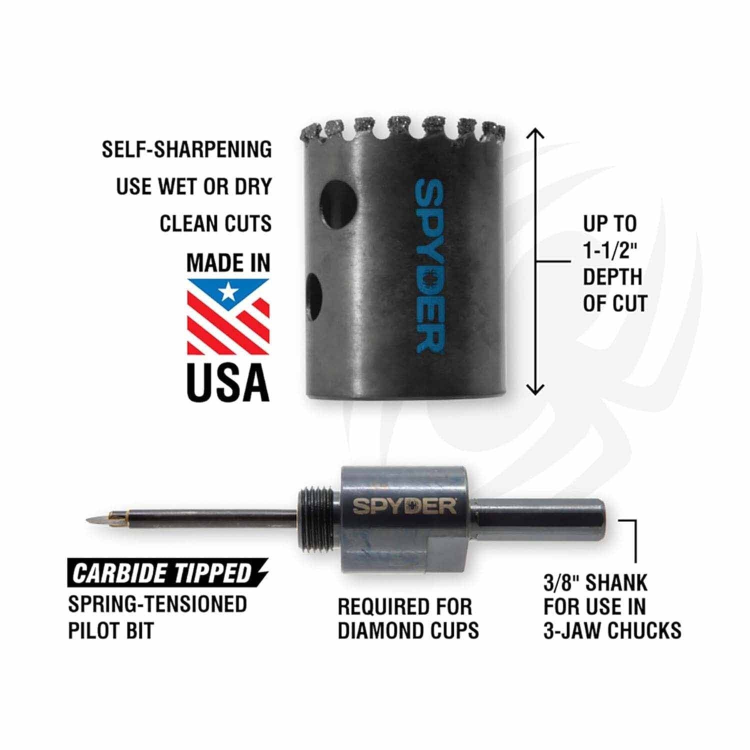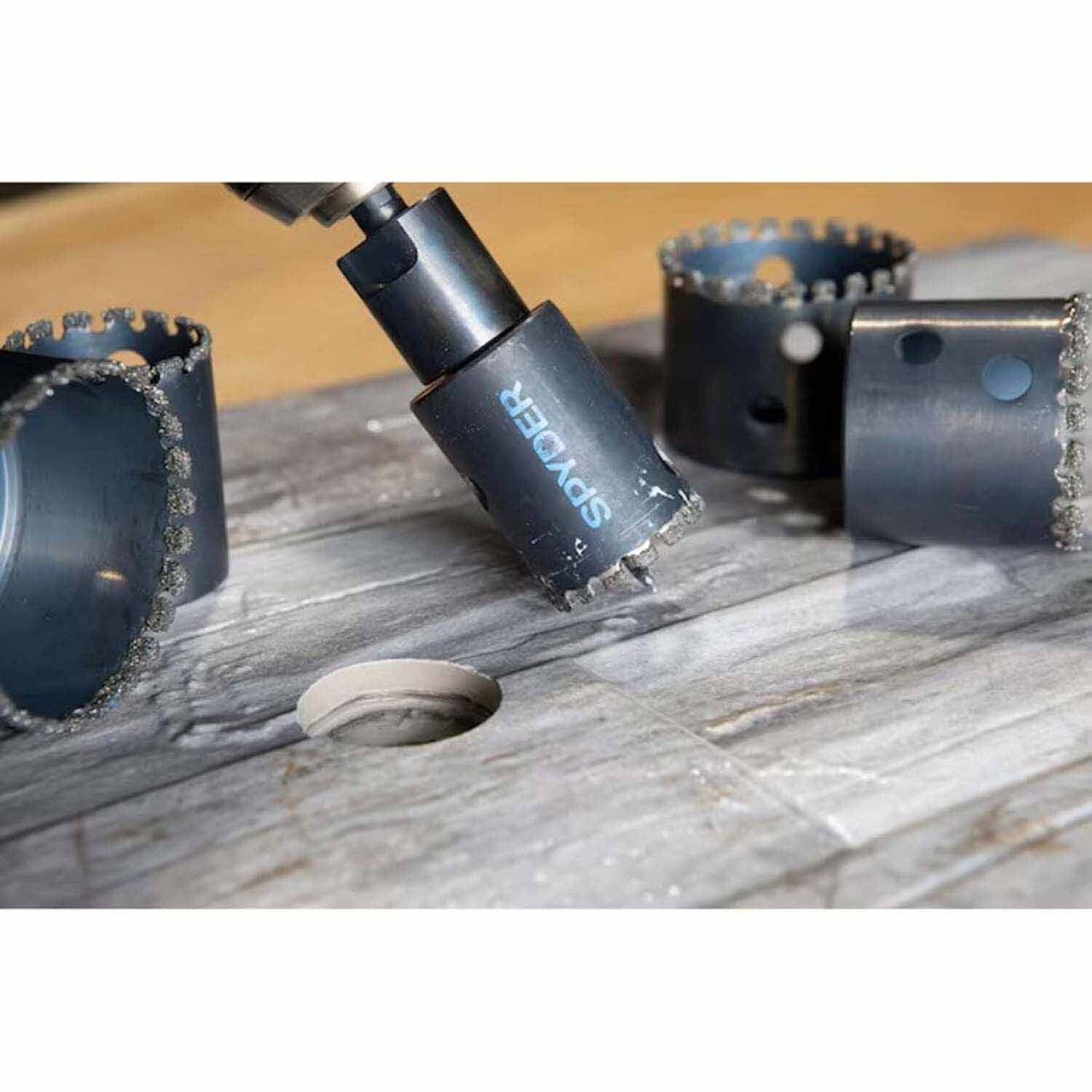Spyder diamond hole saws are the professional choice for hole-making in tile, glass and masonry materials. Premium boron-coated industrial diamond abrasive self-sharpens for quick cuts and long—up to 20x more holes than standard diamond hole saws and up to 10x faster than standard glass and tile bits. A high temperature nickel braze adheres at temperatures up to 1.5x the temperature of braze used on standard diamond hole saws—increasing diamond abrasive retention and saw life. Heavy-duty, single piece construction and vacuum furnace heat treated high-alloy steel provides a reliable cut and consistent, round holes. These saws can be used wet or dry—water spray or immersion will increase tool life, reduce dust and debris, and will create a more quiet cut. Spyder’s diamond hole saws are for use on ceramic, porcelain, granite, slate, marble, glass, fiber cement board, laminates and more. Made in the USA.
