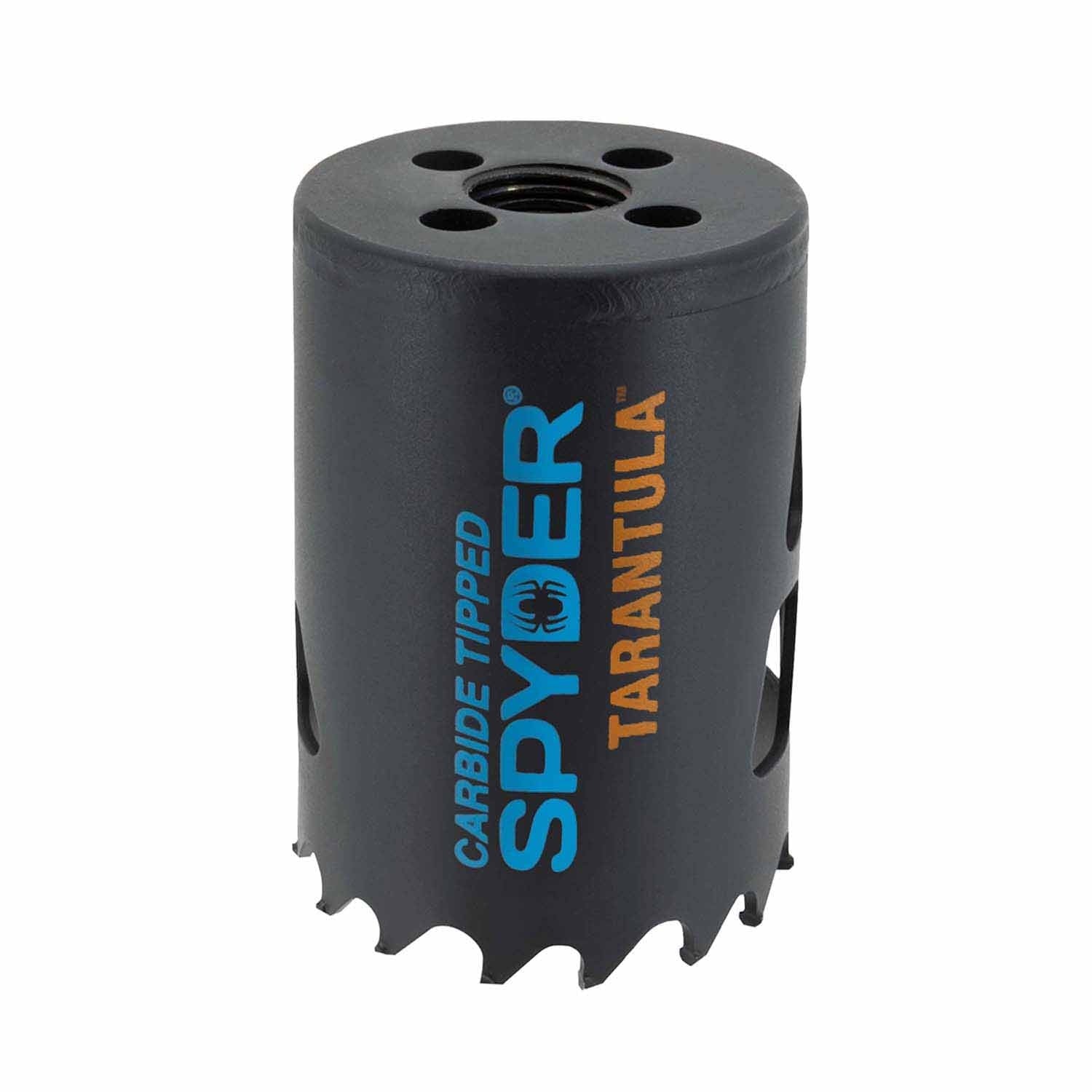 Spyder’s carbide-tipped Tarantula hole saws cut the toughest materials including steel, stainless steel, nail-embedded wood, fiber cement board, plastics, and more. Durable tungsten carbide cutting teeth make up to 50x more cuts than conventional bi-metal hole saws, and they are up to 10x faster — cutting through the toughest materials and extending bit life. Use with Spyder’s Rapid Core Eject arbor system to remove cores without prying (drill hole, press button, pull back the hole saw, and eject the core), cut at an angle, and enlarge existing holes using two adapters on one pilot bit (adapters and pilot bit sold separately). Spyder TCT, Bi-Metal, and Tarantula hole saws fit on Spyder’s Rapid Core Eject arbor and pilot bits and on universal hole saw arbors. Using a drill motor with a support handle is recommended. Not for use in hammer mode or on harder, more abrasive materials.