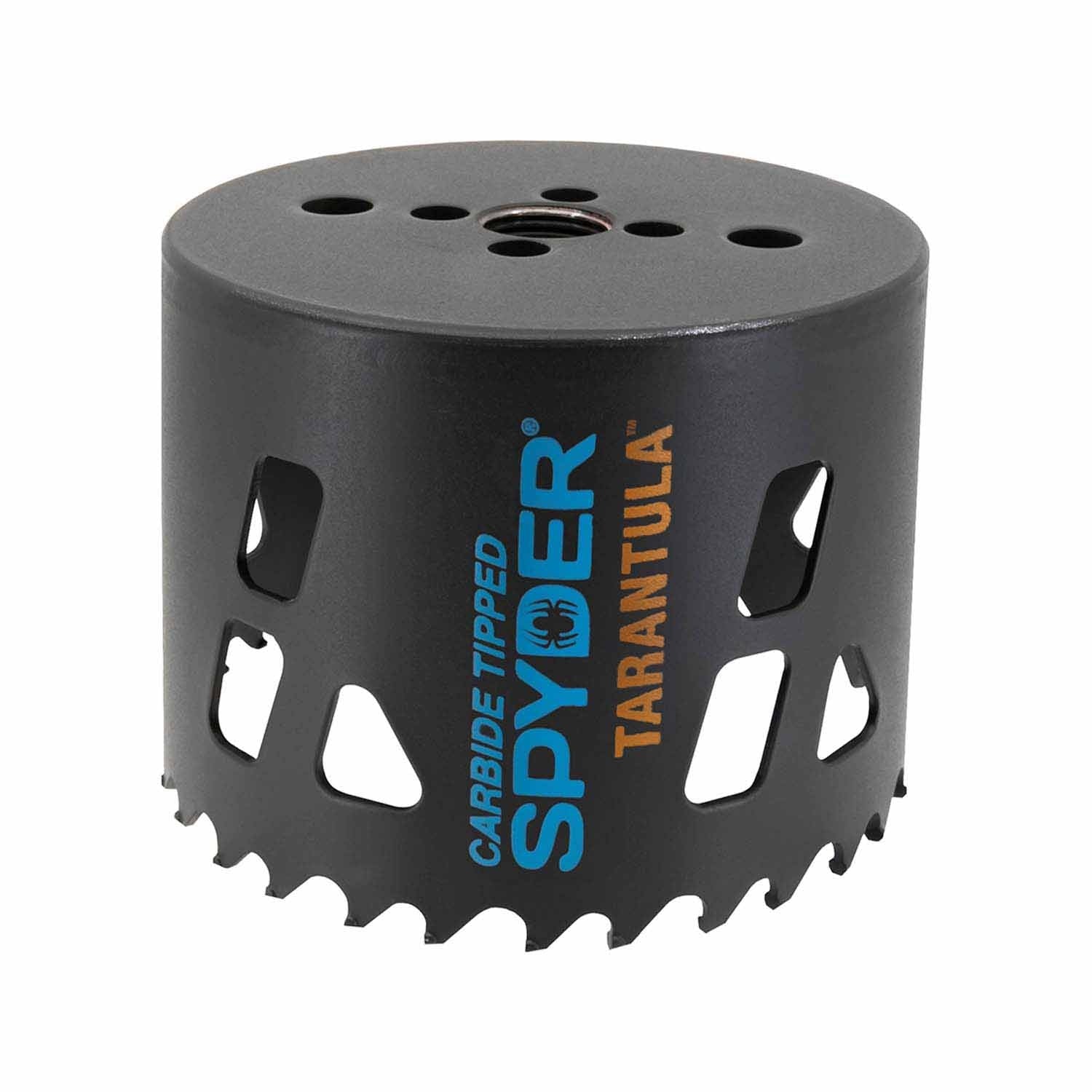 Spyder’s carbide-tipped Tarantula hole saws cut the toughest materials including steel, stainless steel, nail-embedded wood, fiber cement board, plastics, and more. Durable tungsten carbide cutting teeth make up to 50x more cuts than conventional bi-metal hole saws, and they are up to 10x faster – cutting through the toughest materials and extending bit life. Use with Spyder’s Rapid Core Eject arbor system to remove cores without prying (drill hole, press button, pull back the hole saw, and eject the core), cut at an angle, and enlarge existing holes using two adapters on one pilot bit (adapters and pilot bit sold separately). Spyder TCT, Bi-Metal, and Tarantula hole saws fit on Spyder’s Rapid Core Eject arbor and pilot bits and on universal hole saw arbors. Using a drill motor with a support handle is recommended. Not for use in hammer mode or on harder, more abrasive materials.