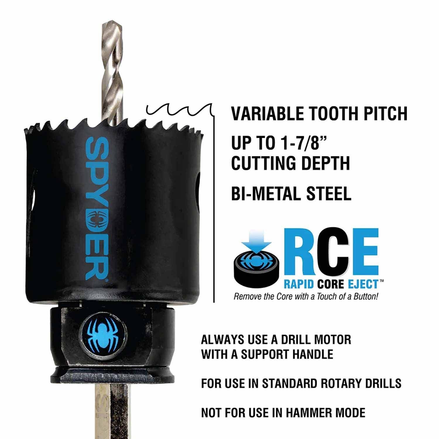 Spyder's Bi-Metal hole saws feature variable tooth pitch geometry and bi-metal steel that make them the durable choice for making holes in wood with nails, metals and plastics. Use Spyder's Rapid Core Eject arbor system to remove cores without prying—drill hole, press button, pull back the hole saw, and eject the core. Cut at an angle, and use two adapters (second adapter sold separately) on one pilot bit to enlarge existing holes. All Spyder hole saws fit on Spyder Rapid Core Eject arbor/pilot bits, and on universal hole saw arbors.