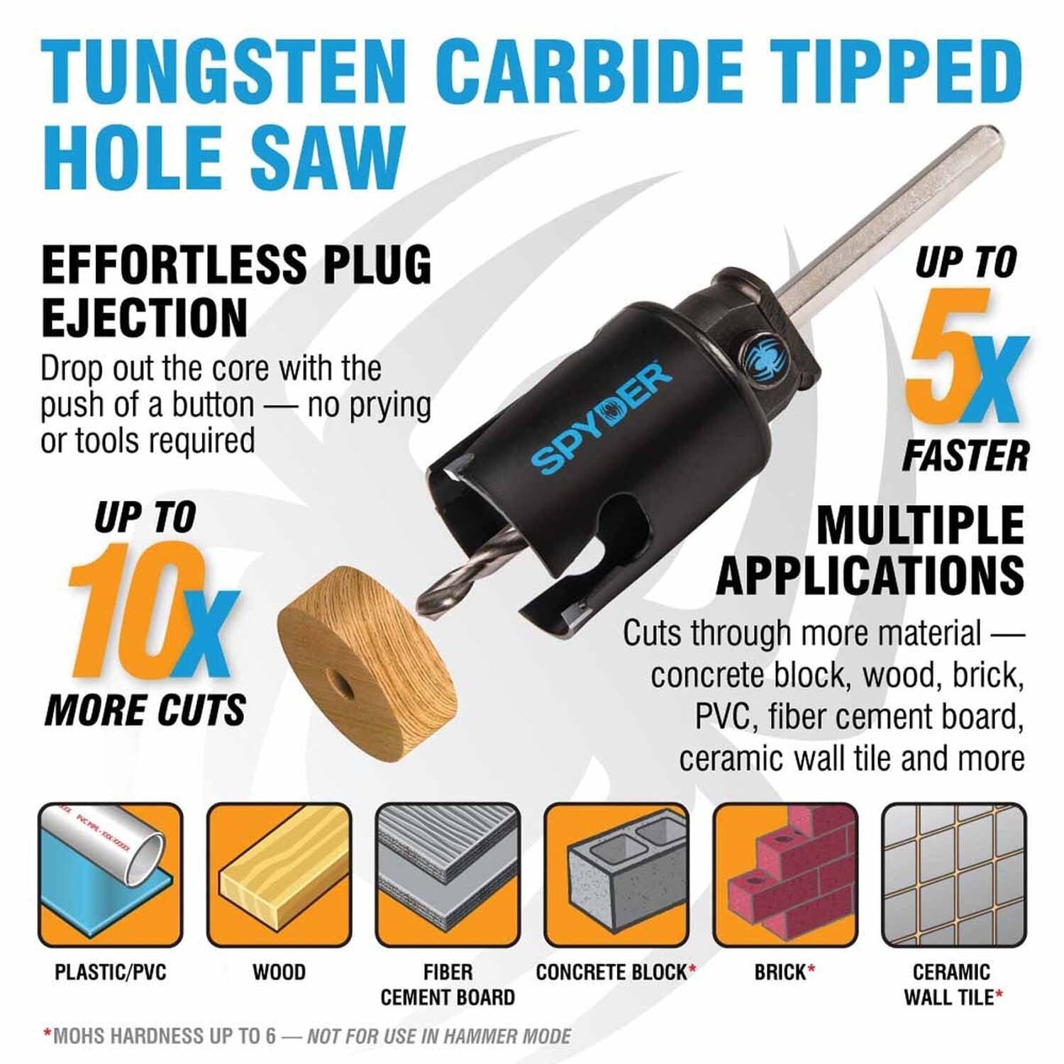 Spyder’s Tungsten Carbide-Tipped (TCT) hole saws cut more materials up to 5x faster and make up to 10x more cuts – lasting longer than conventional bi-metal hole saws. TCT hole saws drill through wood, MDF, fiber cement board, porous concrete block, ceramic wall tile, plastic/PVC and more. Use with Spyder’s Rapid Core Eject™ arbor system to remove cores without prying, cut at an angle, and enlarge existing holes.