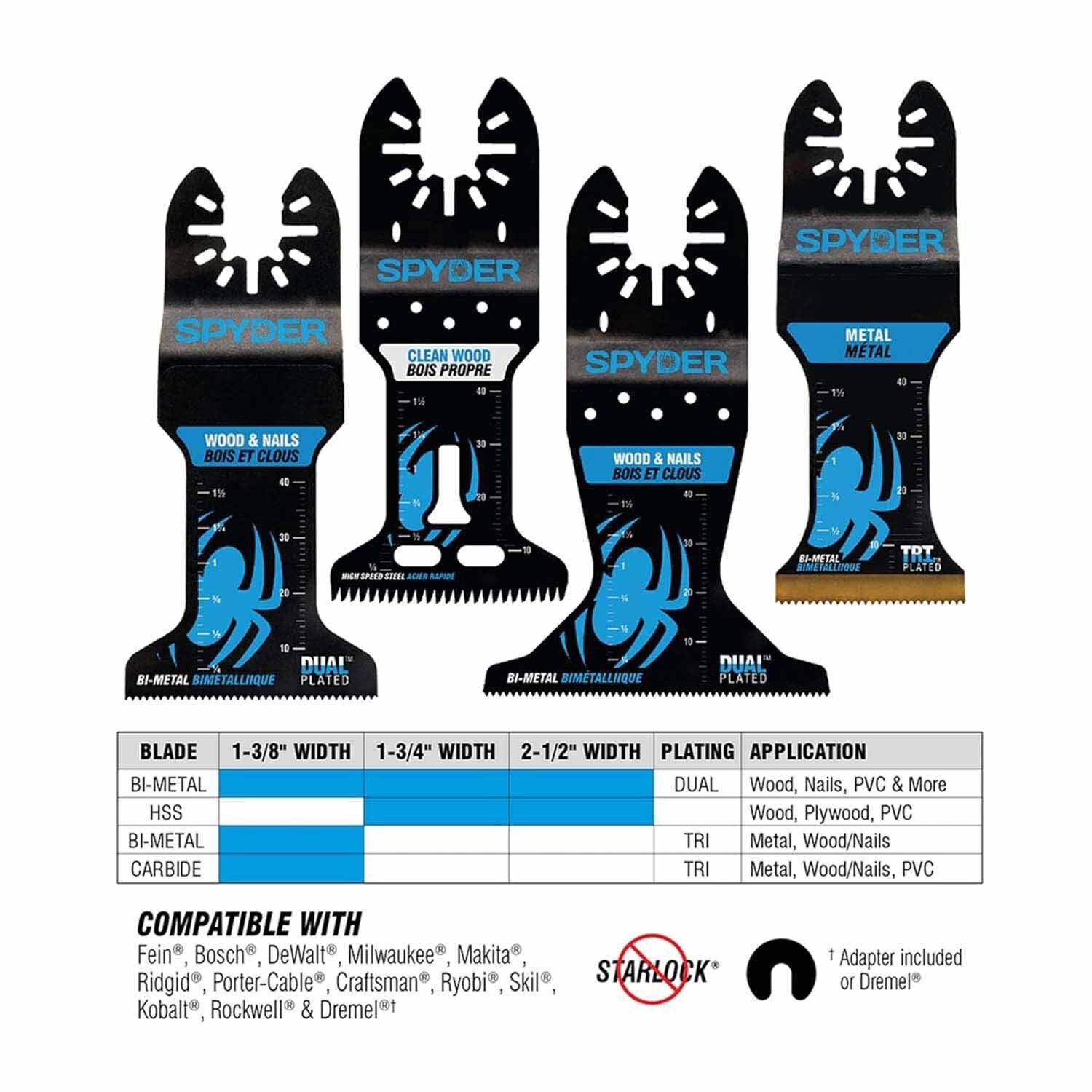 Spyder oscillating tool blades make up to 15x more cuts than standard bi-metal blades for increased life in demanding plunge and lateral cuts in wood, nails, screws, PVC, drywall and more. A universal fit arbor ensures compatibility with all open-back oscillating tools. A full 2? depth of cut on each blade ensures maximum reach and superior cutting tooth velocity. Bi-metal blades feature an 8% cobalt bi-metal cutting edge that resists high cutting heat and these blades are dual/tri-plated for additional friction reduction and edge retention. High speed steel blades feature a Japanese-tooth cutting geometry that makes the cleanest cuts in soft and hard woods. These blades are not compatible with Starlock tools.