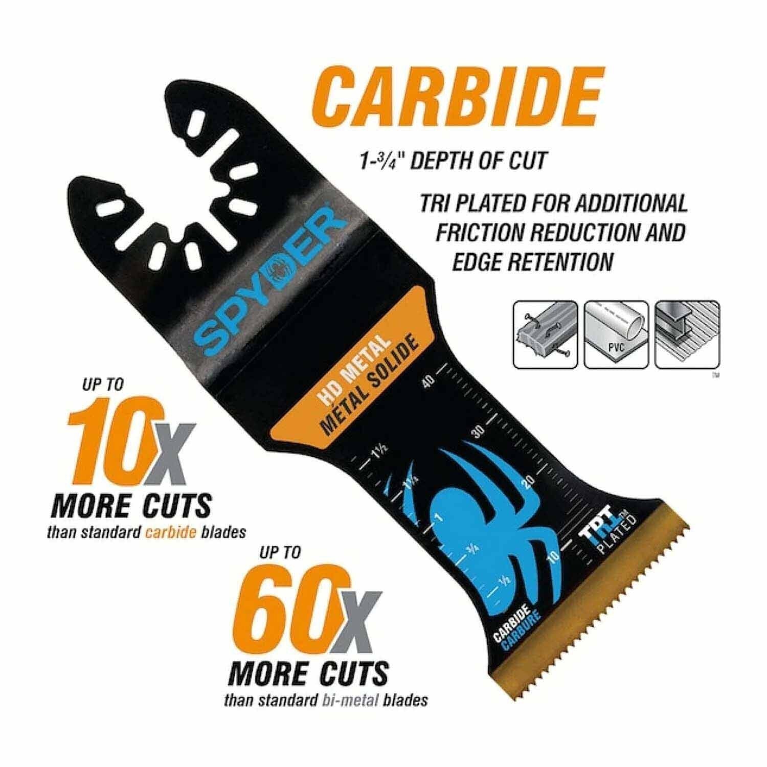 Spyder oscillating tool blades make up to 15x more cuts than standard bi-metal blades for increased life in demanding plunge and lateral cuts in wood, nails, screws, PVC, drywall and more. A universal fit arbor ensures compatibility with all open-back oscillating tools. A full 2? depth of cut on each blade ensures maximum reach and superior cutting tooth velocity. Bi-metal blades feature an 8% cobalt bi-metal cutting edge that resists high cutting heat and these blades are dual/tri-plated for additional friction reduction and edge retention. High speed steel blades feature a Japanese-tooth cutting geometry that makes the cleanest cuts in soft and hard woods. These blades are not compatible with Starlock tools.