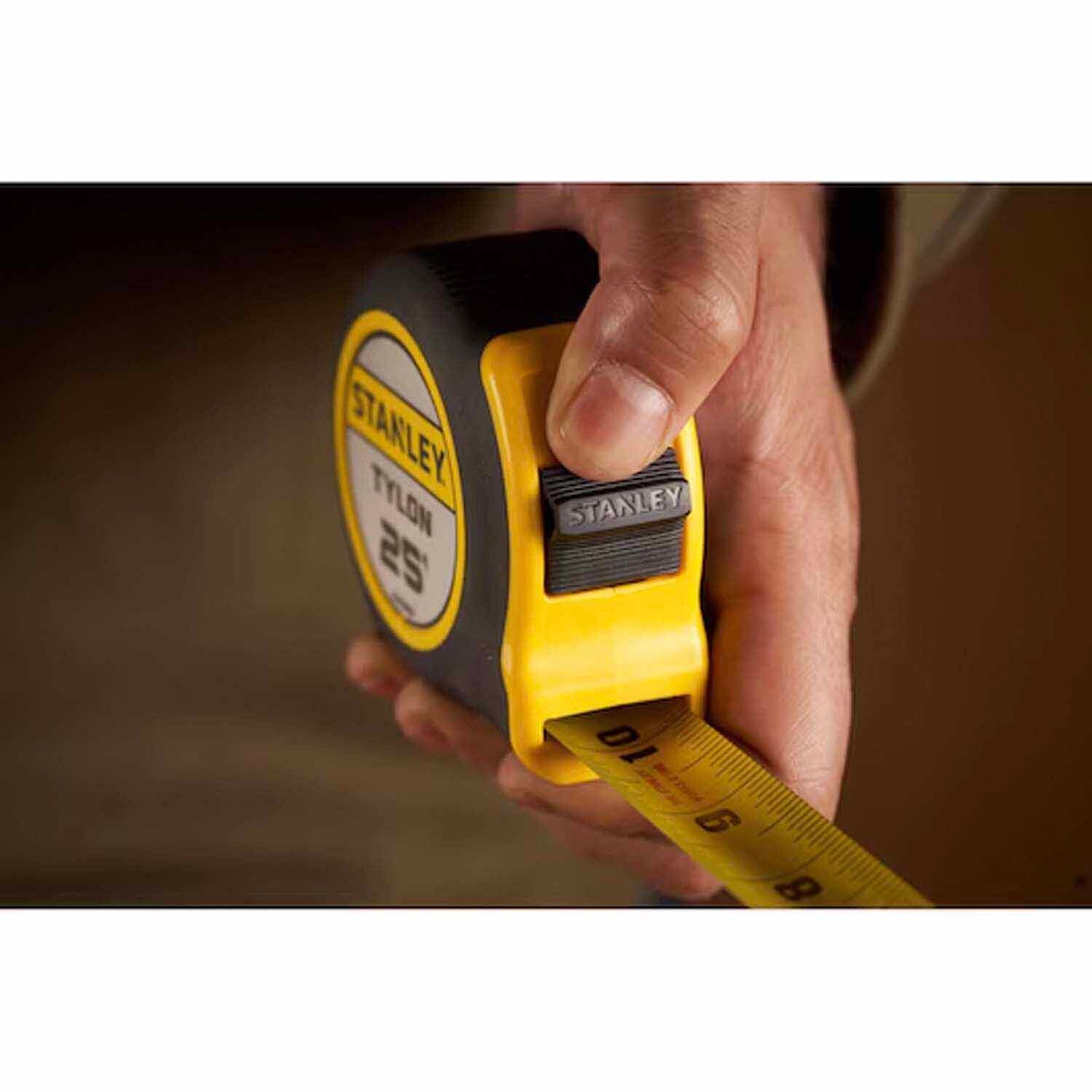 The STANLEY Tylon 25 (1” wide) Tape Measure, with 1” blade width for clear and legible markings. Its Tylon blade coating provides durability and wear resistance, and its TRU-ZERO hook provides for precise inner and outer measurements, moving back and forth along the securing rivets to account for the hook thickness. It features a smooth slidelock function, along with a durable, rubber over molded case with grooves designed for comfort, better grip and stability. Complete with a bright yellow easy-to-read blade and a comfortable bi-material case that can be secured to a belt, pocket, or waistband for improved portability using the integral belt clip.