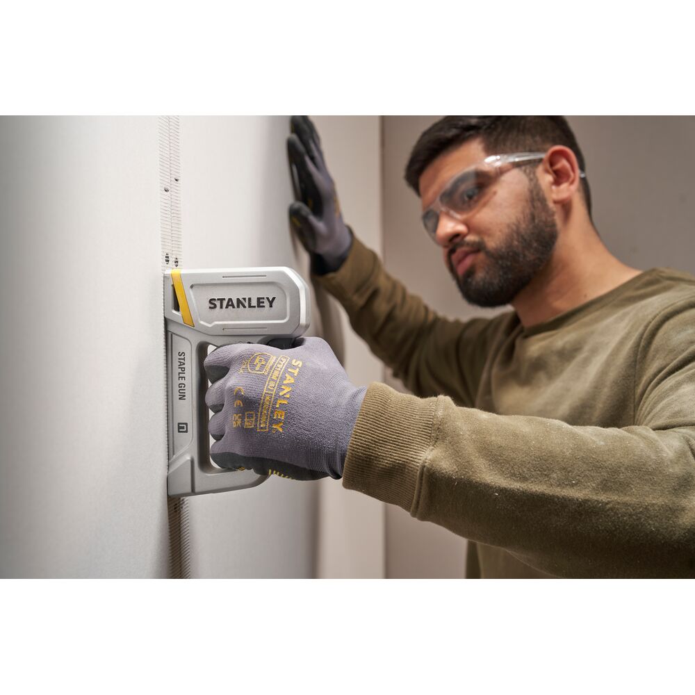 The STANLEY Aluminum Staple Gun is perfect for multiple professional applications including fixing drywall beads and scrim to plasterboard, securing carpets, fencing and roof sheeting. It features an anti-jam mechanism for continuous use and reliable operation, as well as a staple window which provides clear visibility of when a staple reload is required. Takes Type-G Staples.