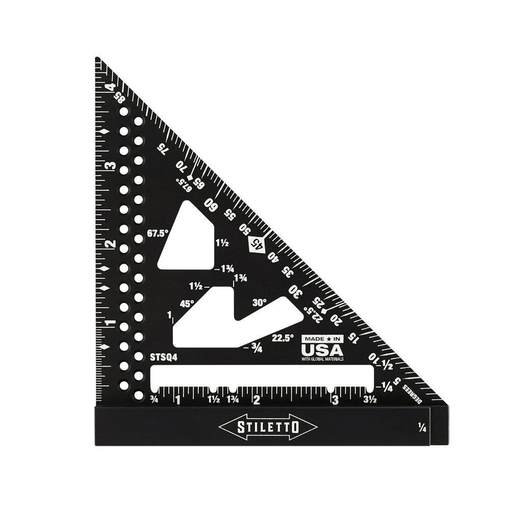The STILETTO 4-1/2” Trim Square is designed for precision and efficiency, ideal for finish carpentry. Additional scribe holes aid in laying out common angles, ripping boards, and setting saw blade height. The 1/4” and 3/16” revel gauge help quick set door casings, while the bottom heel ruler provides marking versatility. The 4-1/2” Trim Square is fully machined, with an anti-glare finish and the most durable coating.