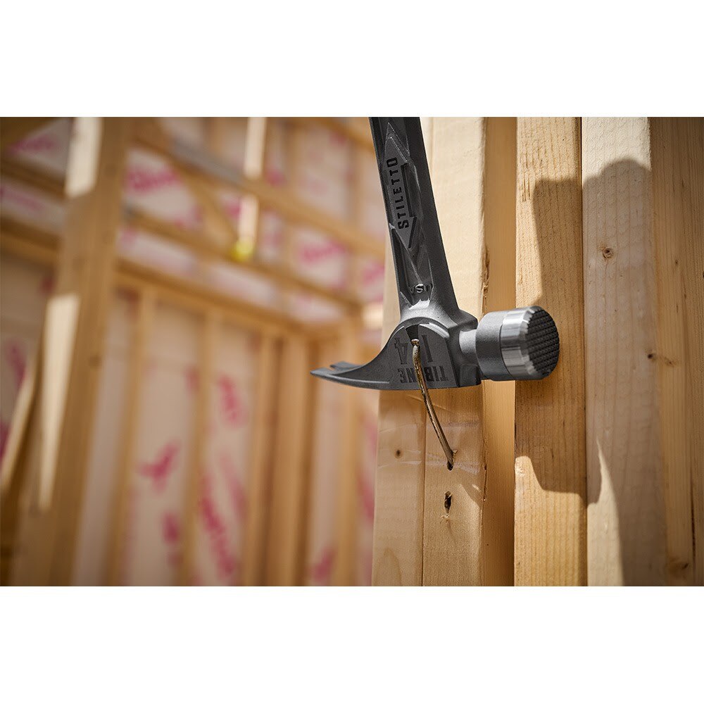 The STILETTO 14oz TIBONE Hammer with Milled Steel Face and Curved Handle is Stiletto Tool's most powerful and most durable hammer. This All-Titanium hammer is 45% less weight and hits like steel. The durable TIBONE design is best for framing and pulling nails. The 180° Side Nail Puller and Magnetic Nail Starter fit up to 16D and Duplex Nails. The TIBONE Titanium Framing Hammer features a replaceable steel face and multiple grip colors, extending the life of the hammer and providing a personal touch.
