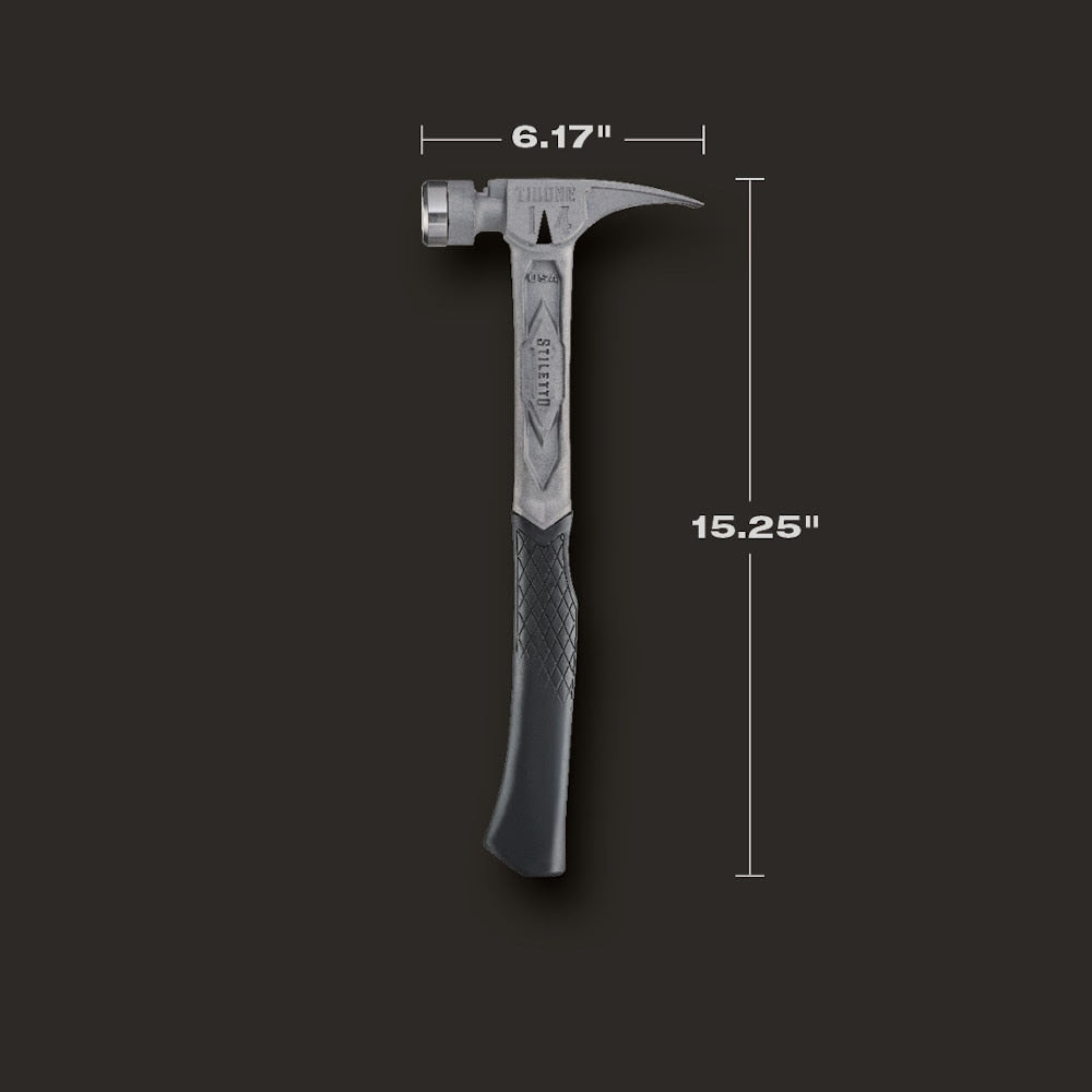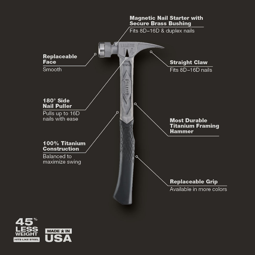 The STILETTO 14oz TIBONE Hammer with Smooth Steel Face and Curved Handle is Stiletto Tool's most powerful and most durable hammer. This All-Titanium hammer is 45% less weight and hits like steel. The durable TIBONE design is best for framing and pulling nails. The 180° side nail puller and Magnetic Nail Starter fit up to 16D and Duplex Nails. The TIBONE Titanium Framing Hammer features a replaceable steel face and multiple grip colors, extending the life of the hammer and providing a personal touch.