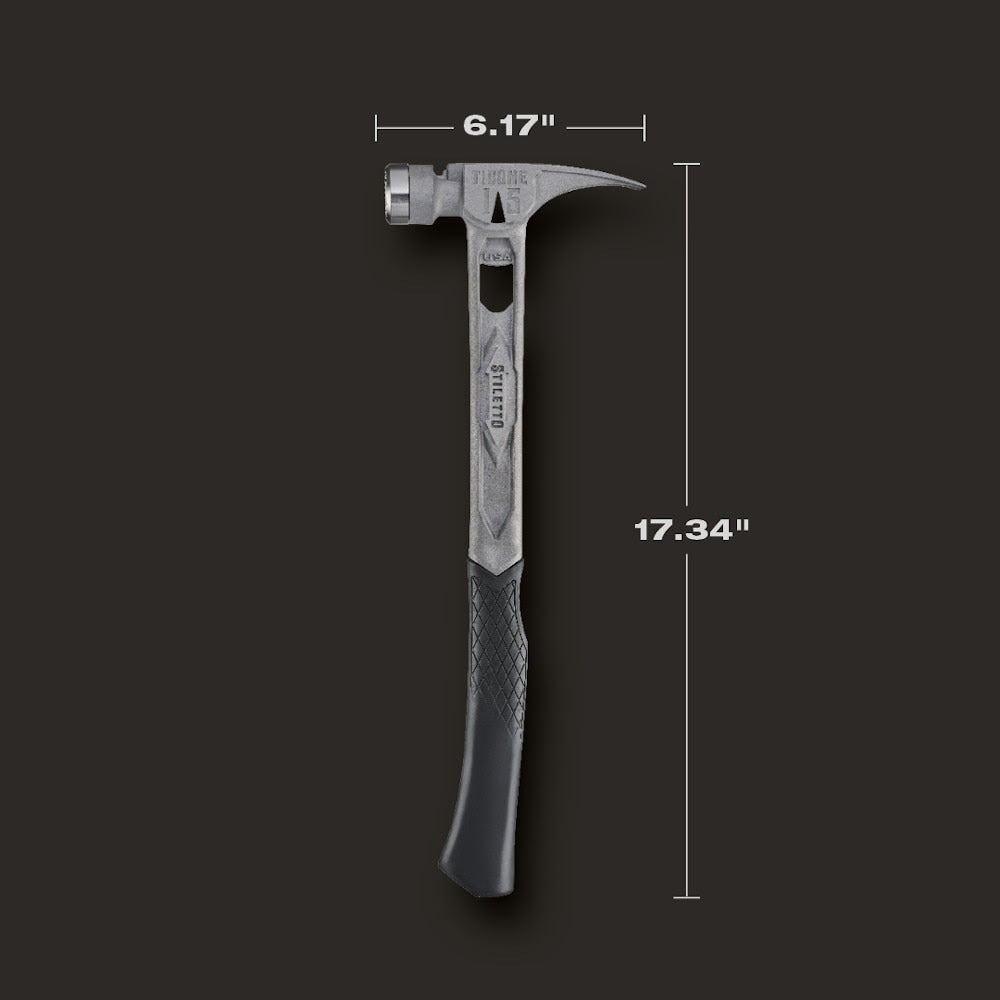 The STILETTO 15oz TIBONE Hammer with Milled Steel Face and Curved Handle is Stiletto Tool's most powerful and most durable hammer. This All-Titanium hammer is 45% less weight and hits like steel. The durable TIBONE design is best for framing and pulling nails. The 180° side nail puller and Magnetic Nail Starter fit up to 16D and Duplex Nails. The TIBONE Titanium Framing Hammer features a replaceable steel face and multiple grip colors, extending the life of the hammer and providing a personal touch.