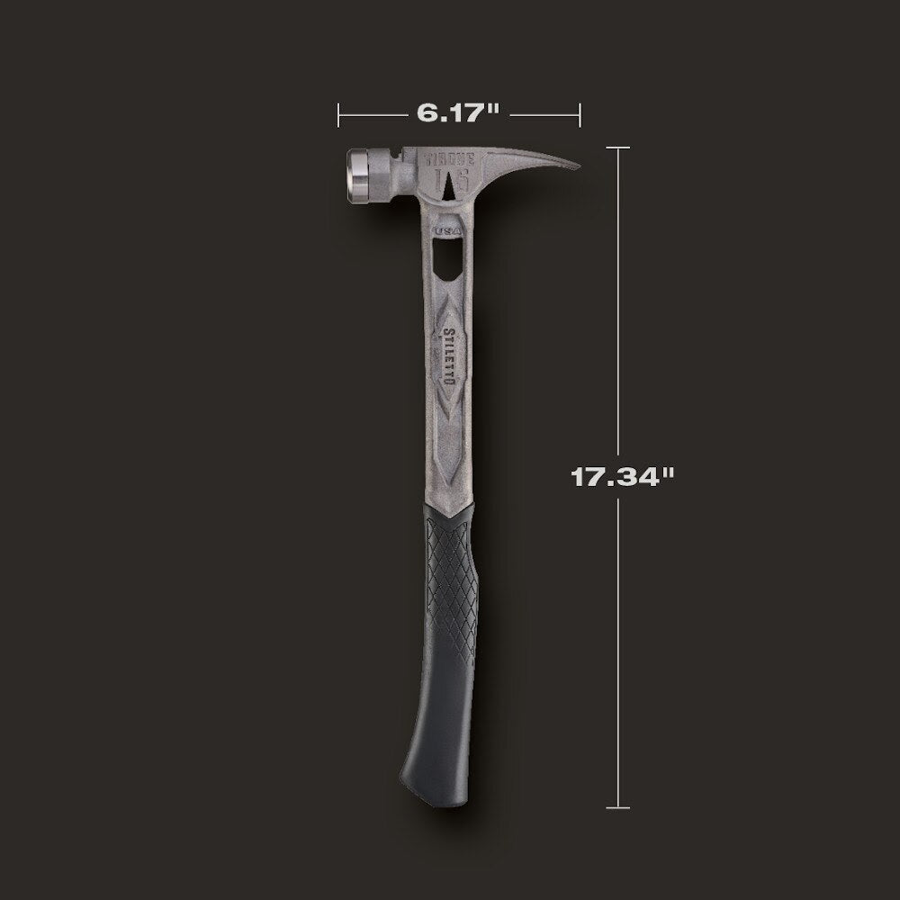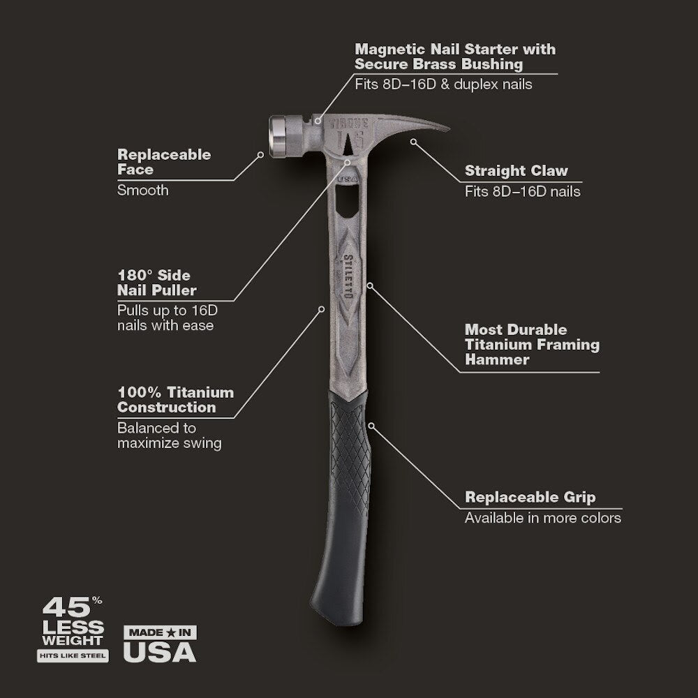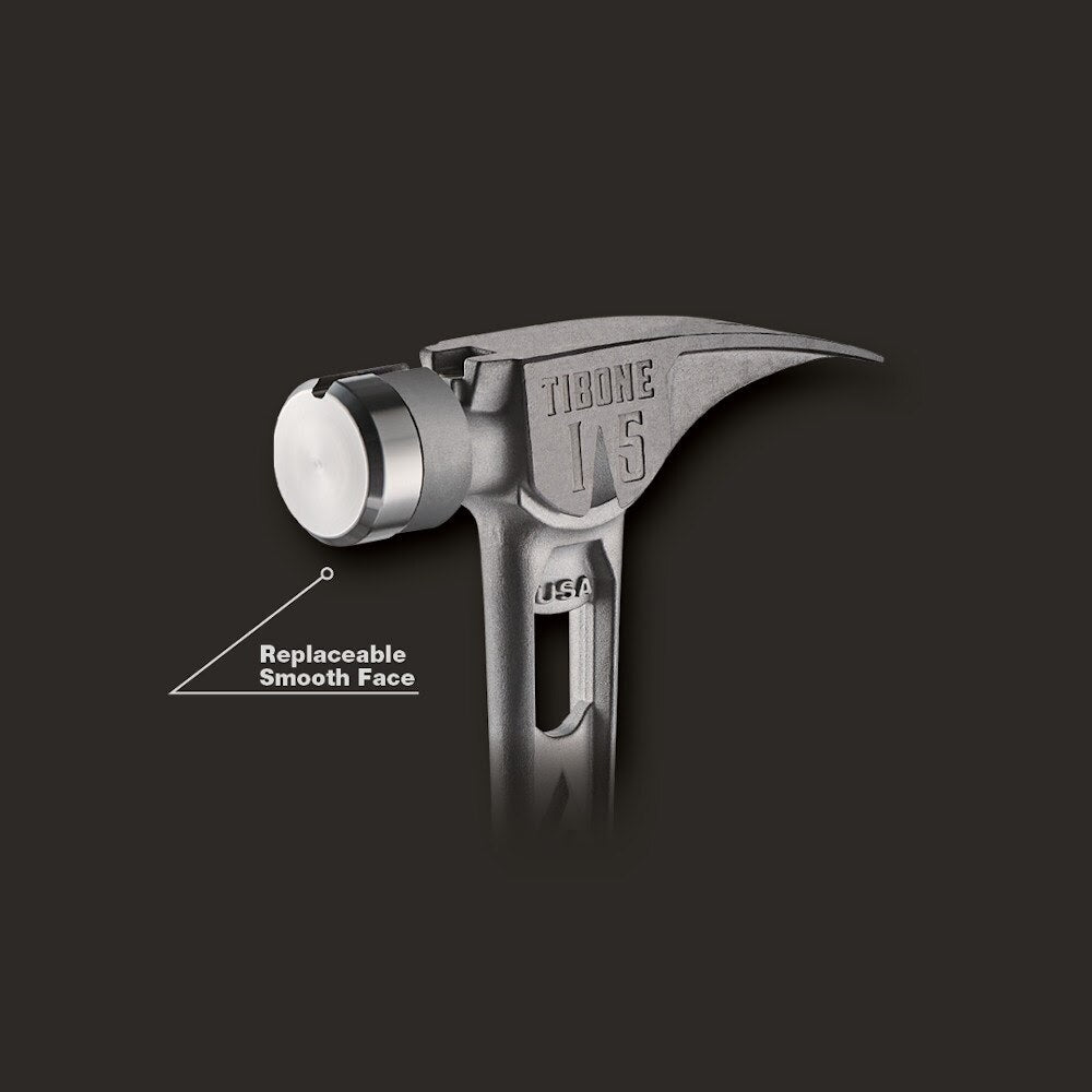 The STILETTO 15oz TIBONE Hammer with Smooth Steel Face and Curved Handle is Stiletto Tool's most powerful and most durable hammer. This All-Titanium hammer is 45% less weight and hits like steel. The durable TIBONE design is best for framing and pulling nails. The 180° side nail puller and Magnetic Nail Starter fit up to 16D and Duplex Nails. The TIBONE Titanium Framing Hammer features a replaceable steel face and multiple grip colors, extending the life of the hammer and providing a personal touch.