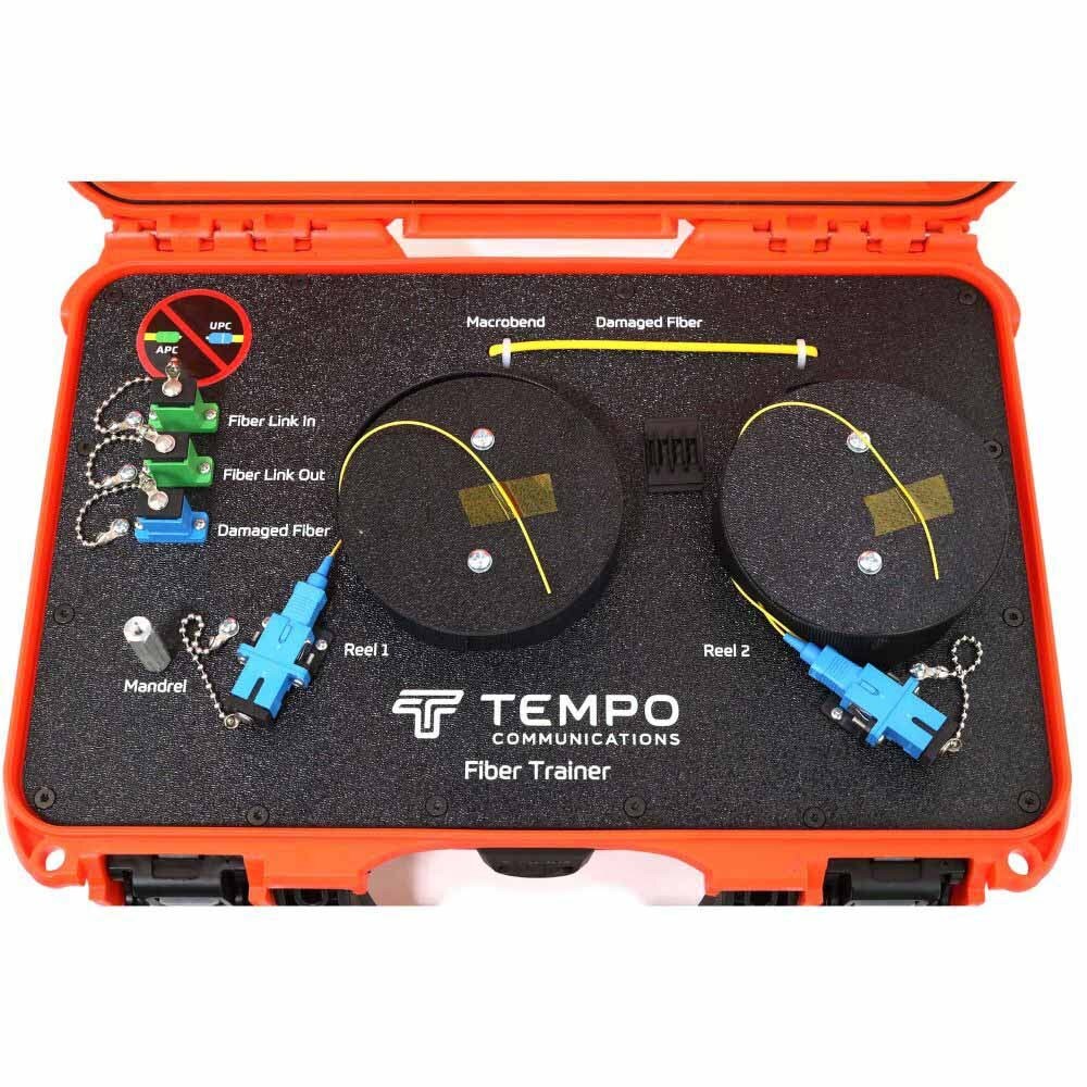 Tempo recognized a widespread need for basic hands-on training for the installation, testing, and maintenance of fiber optic networks. In response, we custom-designed the Tempo Communications Fiber Trainer to provide the platform required for conducting hands-on fiber experiments. The Tempo Communications Fiber Trainer provides a compact platform used to train fiber optic technicians. The Fiber Trainer has loss events that simulate a faulty connector, a Macrobend and a damaged fiber optic cable. The 1km fiber link provides the student technician a typical fiber link that has a fault midway. This allows the technician setup the OTDR, test and evaluate the 1km link. The two fiber spools provide sufficient fiber for fusion splicing exercises. The connectors on the ends of the fiber spools allow for convenient connections for loss testing so that the student technician can measure and validate fusion splice loss. The Fiber Trainer is built with the components a technician needs to learn how to: Cleave and splice fiber optic cables with a fusion splicer. Inspect and Clean connectors and bulkheads with a video inspection probe and typical cleaning supplies. Locate fiber faults using a visual fault locator. Measure loss of the fiber using optical power meters and light sources. Utilize an OTDR to measure length and loss using Auto or Expert modes. Each Fiber Trainer requires one Consumable Kit (SPC01) which provides the necessary cables, cleaning supplies, and supplementary items to perform the experiments during the hands-on portion of the learning modules.
