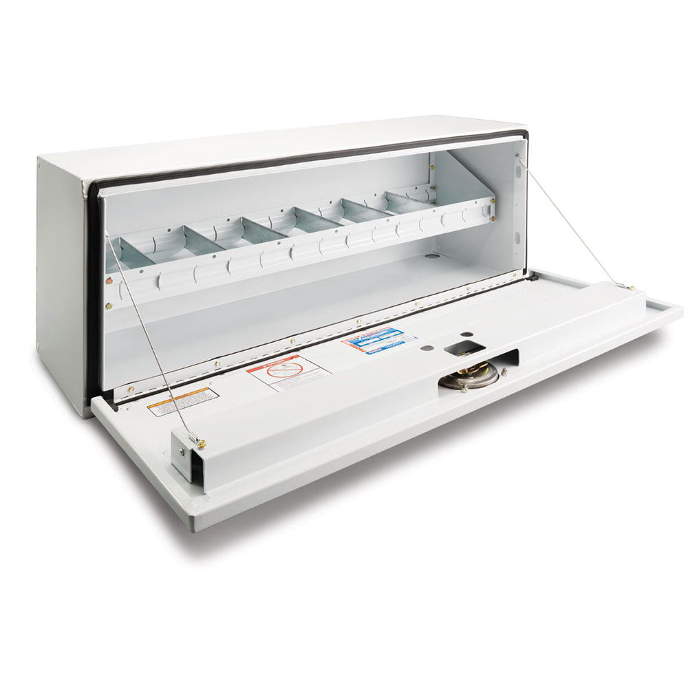 Perfect for Hi-Side and Super-Side boxes, the Model 200-3 Accessory Parts Cabinet Tray measures 41.5in long and 9.5in wide. The steel cabinet tray in Brite White ARMOR TUF® Powder Coat finish ensures years of dependability comes with adjustable dividers and can be bolted to back wall of the box.