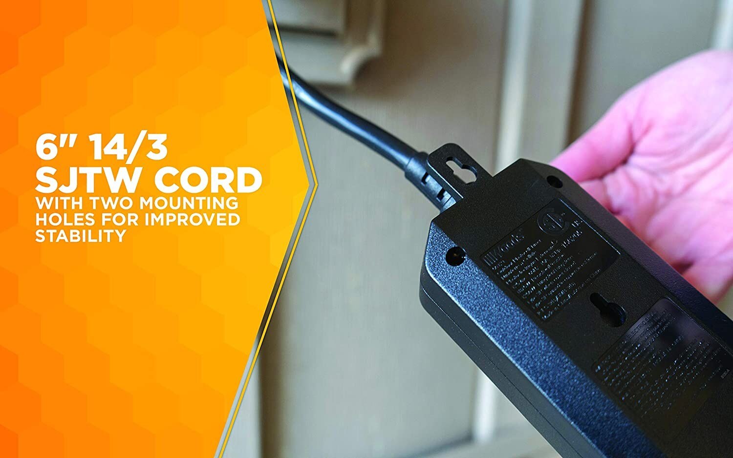 - EASY SET UP: 6in 14/3 SJTW Cord with Two Mounting Holes for Improved Stability