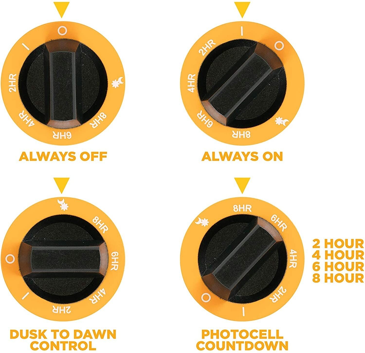 - AUTOMATICALLY turns ON at dusk and OFF at dawn, or after 2, 4, 6, or 8 hours, settings repeat daily