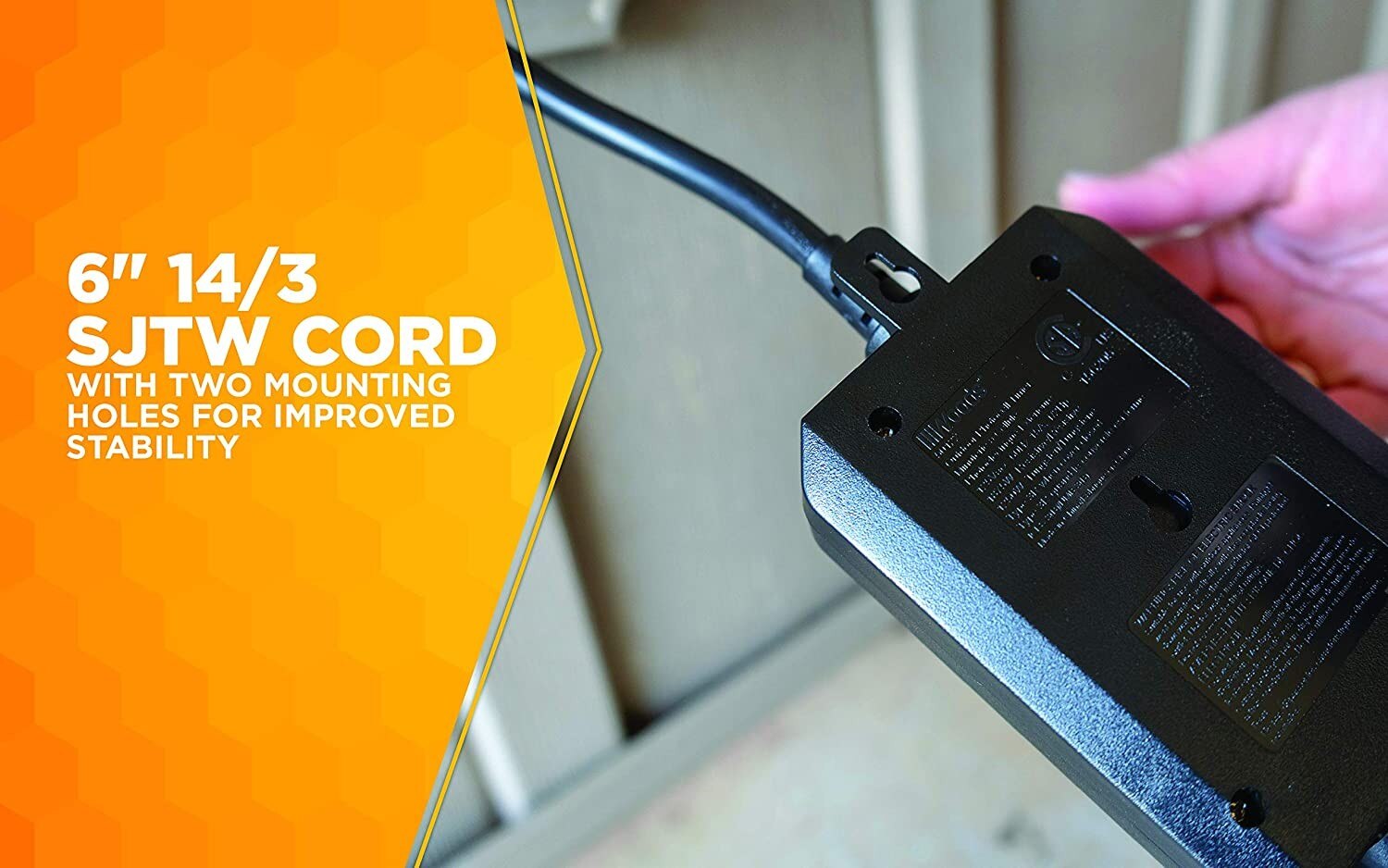 - EASY SET UP: 6in 14/3 SJTW Cord with Two Mounting Holes for Improved Stability