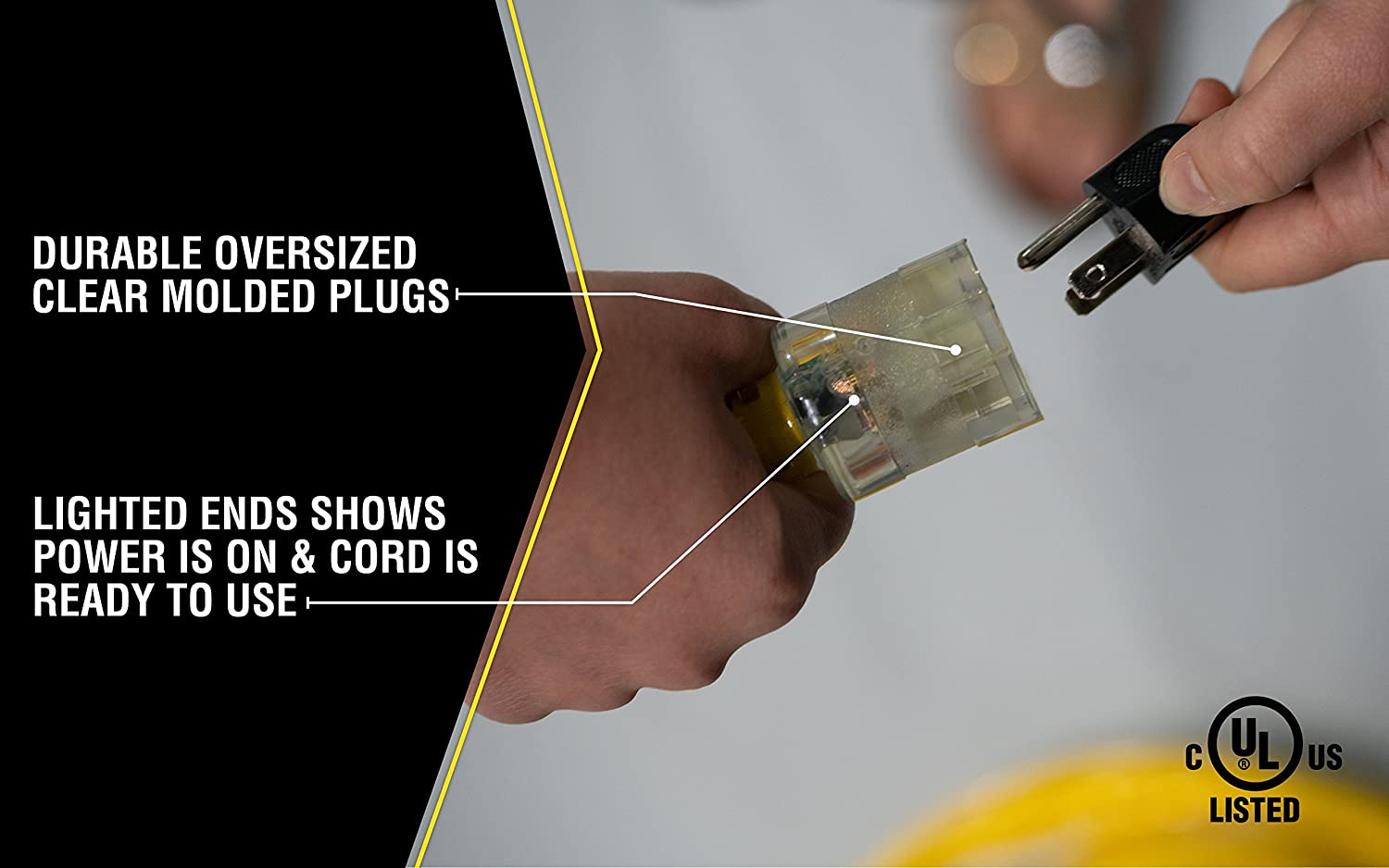 Yellow Jacket 2805 10/3 Heavy-Duty 15-Amp SJTW Contractor Extension Cord with Lighted End, 50-Feet. Super flexibility in cold and hot weather. Power Lite power indicator lamp glows through the extra heavy, clear molded plug when the cord has power. Extra heavy, clear molded plugs are rugged, durable and oversized. Recommended for use with heavy duty equipment and tools. Meets OSHA specifications, UL Listed. 10 Gauge.