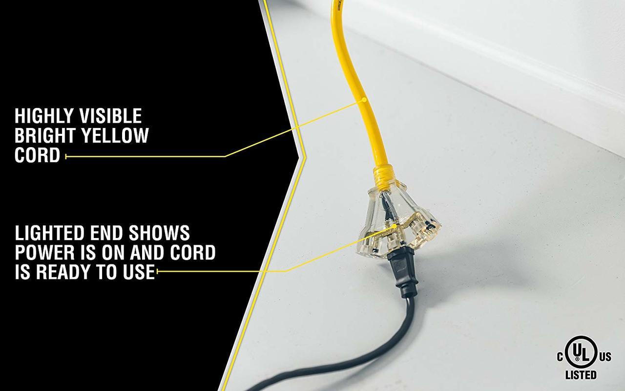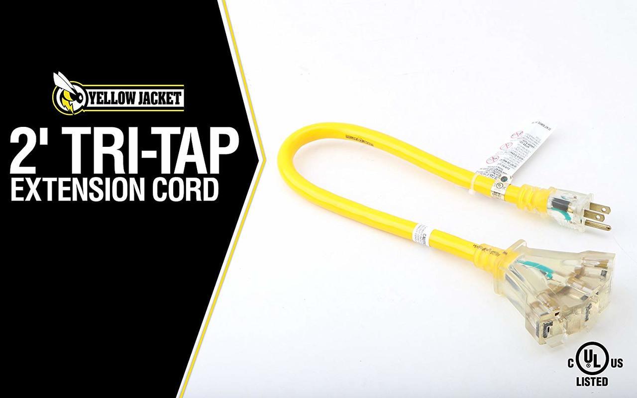 Yellow Jacket 2882 12/3 Heavy-Duty 15-Amp SJTW Contractor Extension Cord with Lighted Power Block, 2-Feet. Extra heavy duty 600-Volt insulated wire. Molded power block stands up to rough use on jobsites. Eliminates the cost and clutter or running multiple cords. Power Lite power indicator lamp glows through the extra heavy, clear molded plug when the cord has power. Meets OSHA specifications, UL Listed. 12 Gauge. The Yellow Jacket (R) brand is a registered trademark of Coleman Cable Inc.